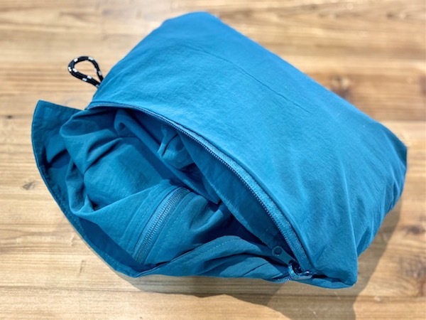 フロントポケットを起点に裏返すことでコンパクトに収納できる、パッカブル仕様となっております。