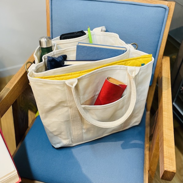丈夫なキャンバス生地とやや広めのマチで、中の荷物が溢れたりせず自立してくれるのも嬉しいポイント。
