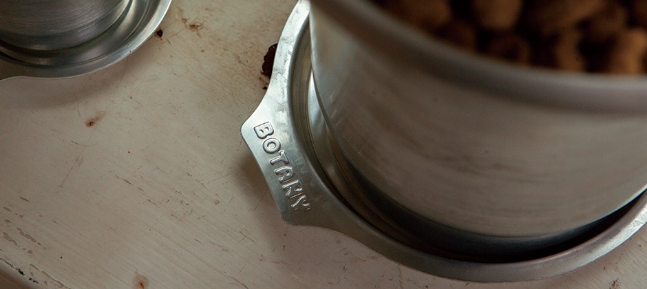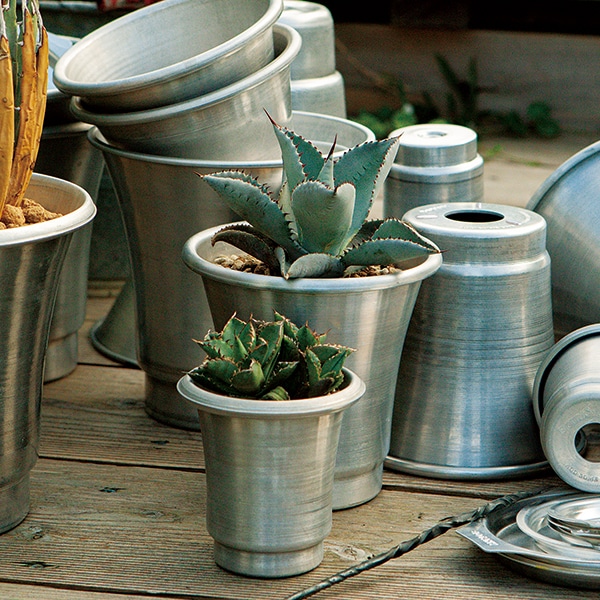 ■工業製品を彷彿とさせるラフでタフな質感と形状に、 鉢底とソーサーに配されたエンボスロゴが、コレクター魂を刺激するBOTANYのアルミポット&ソーサー。