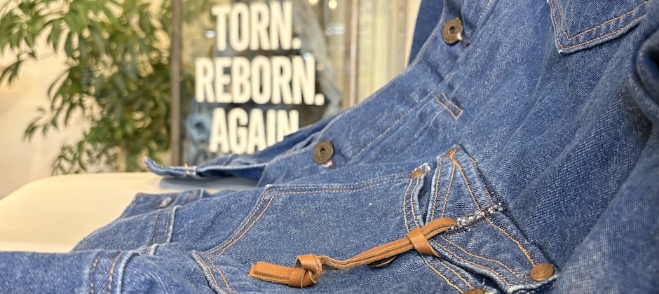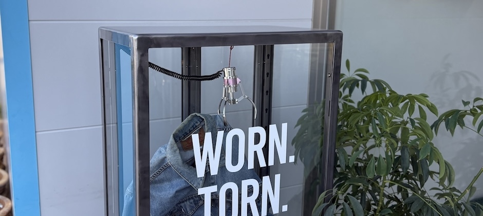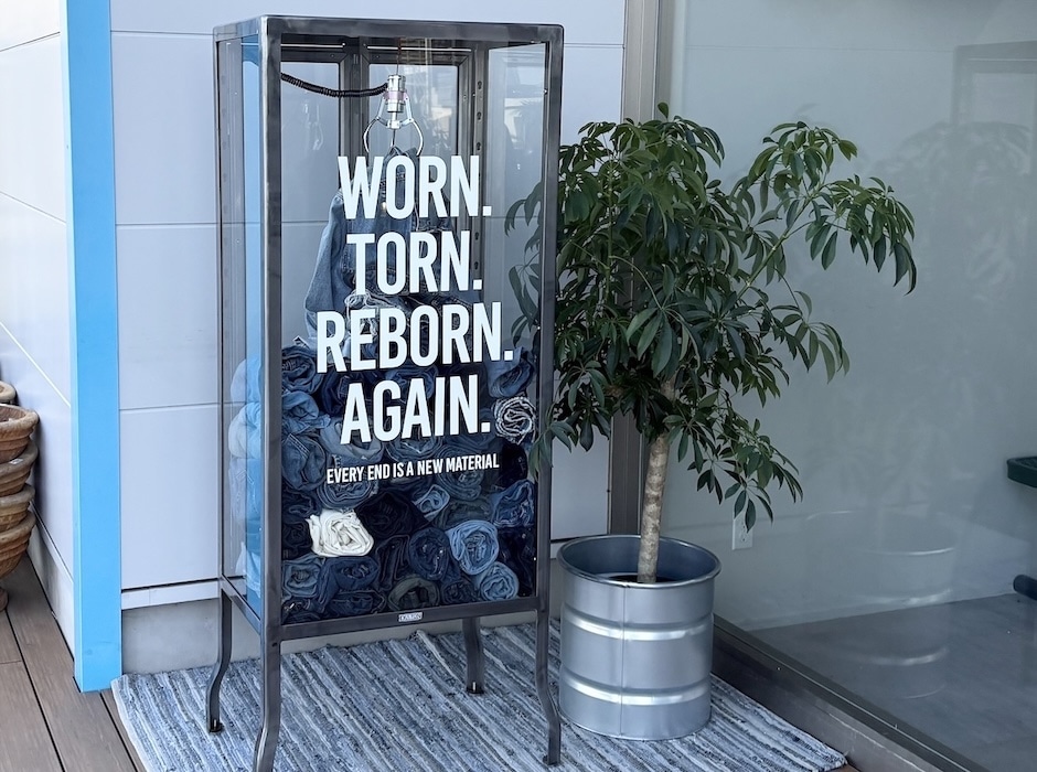 使い込まれたデニムを敷き詰め、クレーンゲームのように吊り上げた一本のデニムを主役に。