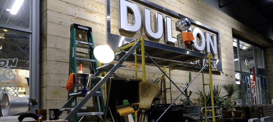 クリップランプを灯して、看板の DULTON ロゴを丁寧に拭き上げていきます。