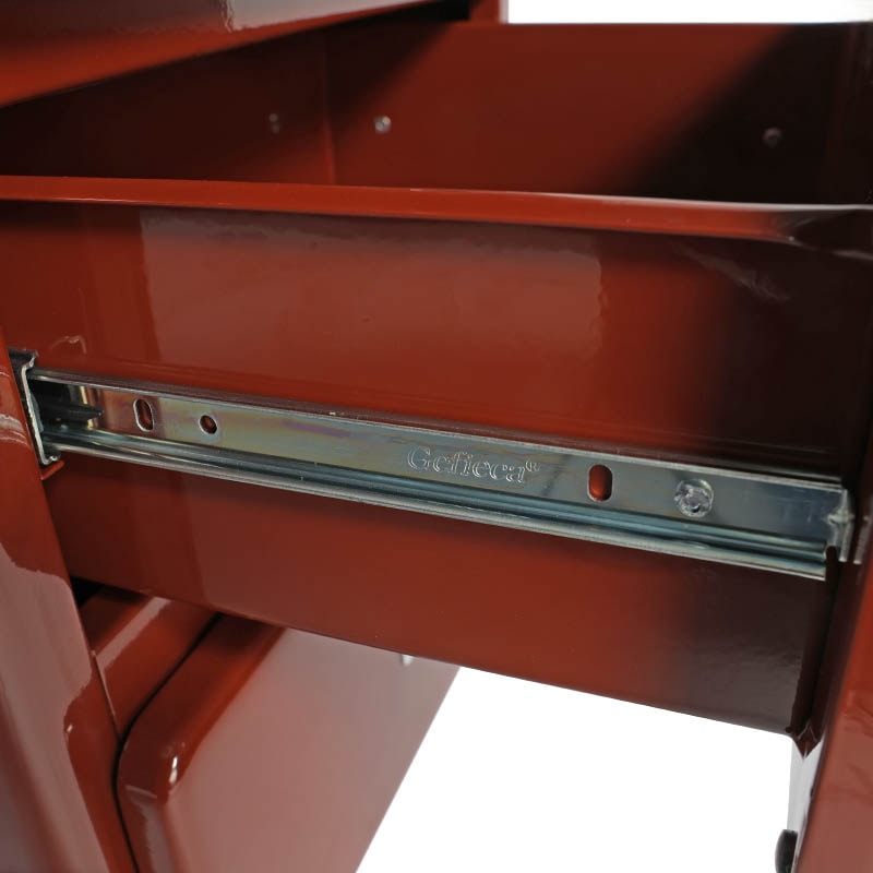 レール式で奥までしっかり引き出せるので、収納物の出し入れがスムーズに行えます。左右レールのつまみを押さえることで、ドロワーを取り外すことができるので、お手入れも楽々。