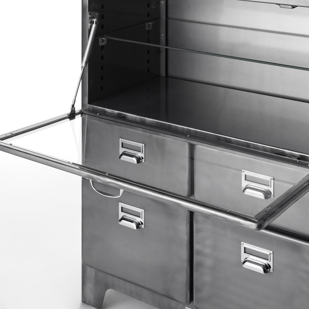 大胆な縦開きのガラス扉と、深さの異なるドロワーが特徴のスチール製カップボード。キッチン・ダイニングでは、あらゆるモノをストックする中で、食器やツールを美しく見せる役割も担います。多少タフに使ってもへこたれることのない堅牢なボディは、ガレージ等ではまた違った表情に。何年経っても出会った時と変わらずに愛せる収納家具です。