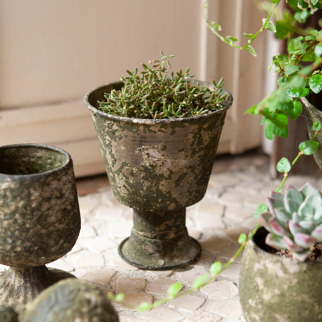 苔のような風合いを施したアイアン素材のディスプレイアイテム。長い年月、庭の片隅で風雨にさらされてきたかのような、味わい深い質感です。周りの植物や小物をやさしく引き立て、空間に自然な温もりを与えます。シリーズで揃えたり、ウッドやビンテージ品と組み合わせたり、個性的なコーディネートをお愉しみください。