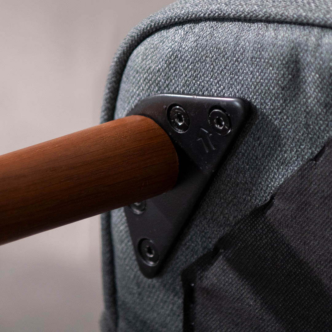 あたたかい正面とクールな背面の二面性を愉しめるデザインです。ブラウンの木脚が自然な風合いをプラス。色のコントラストが、シンプルな空間にリズムを与えます。