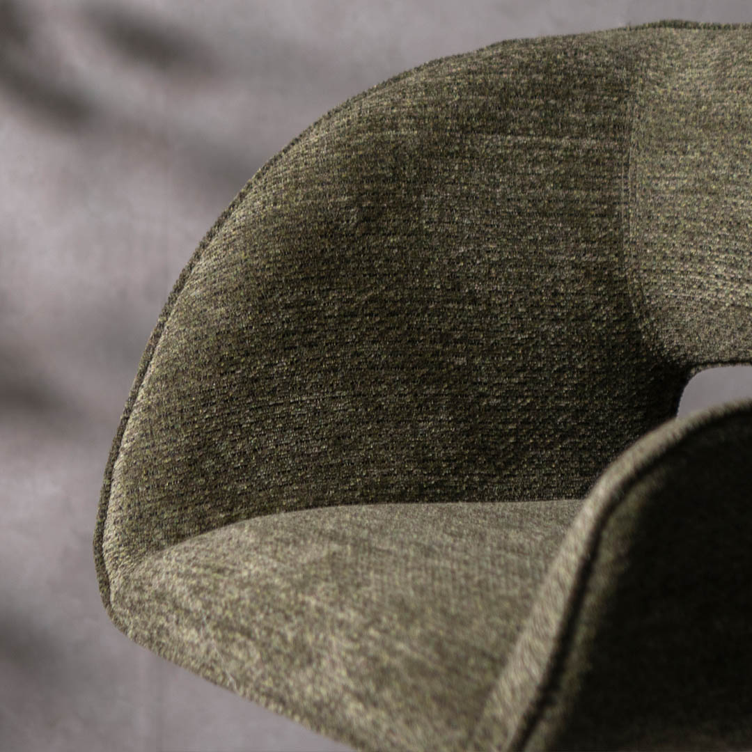 背もたれから肘掛けへと続く曲線が、体をやさしく支えます。程よい硬さのクッションと立体的な座面設計で、360°回転の機能性も完備。フォルムの美しさと使い心地、どちらも妥協しない仕上がりです。