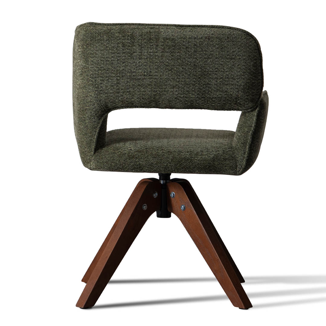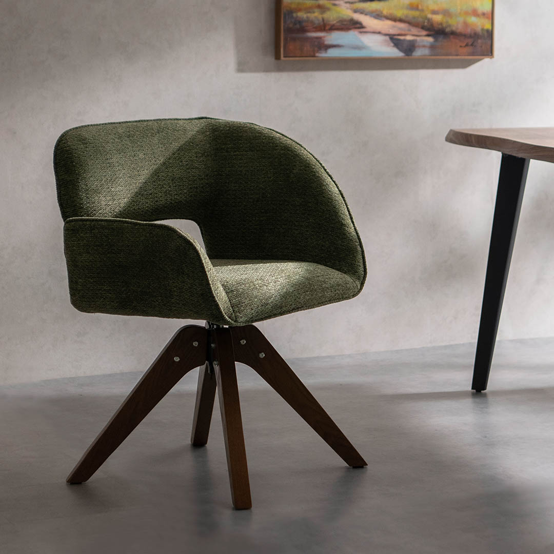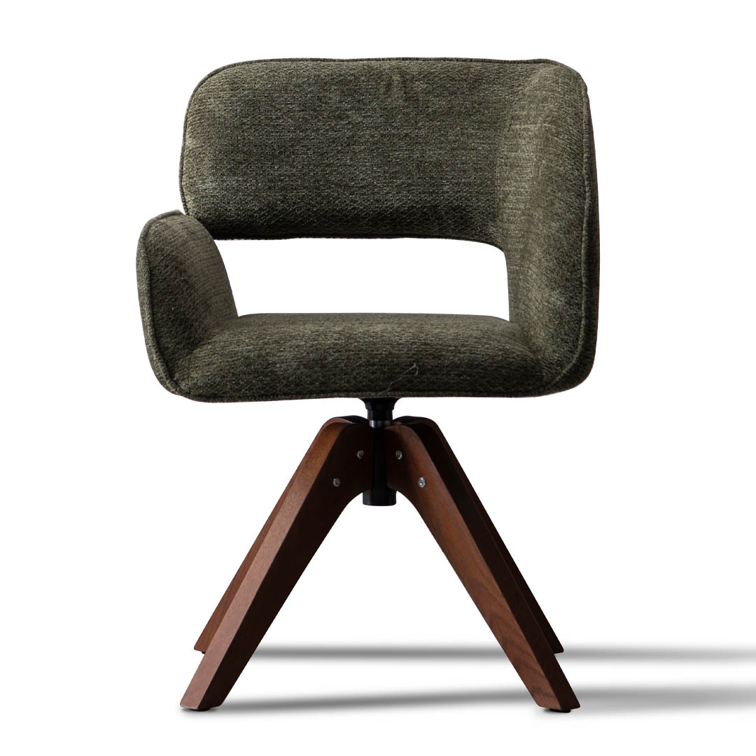背もたれから肘掛けへと続く曲線が、体をやさしく支えます。程よい硬さのクッションと立体的な座面設計で、360°回転の機能性も完備。フォルムの美しさと使い心地、どちらも妥協しない仕上がりです。