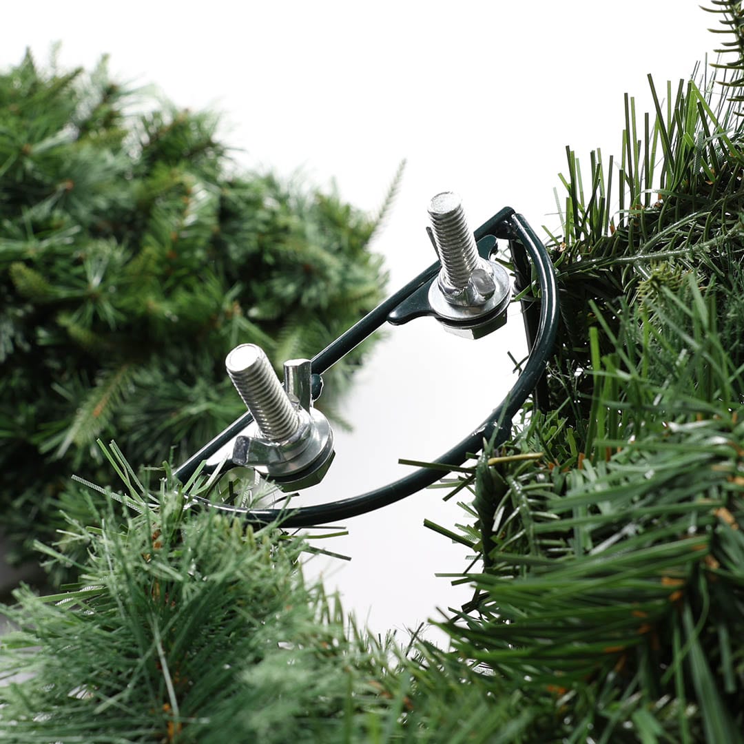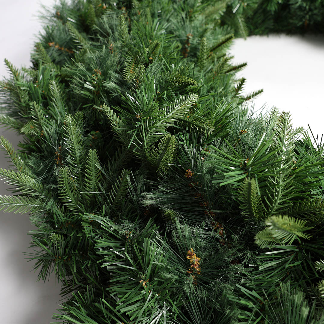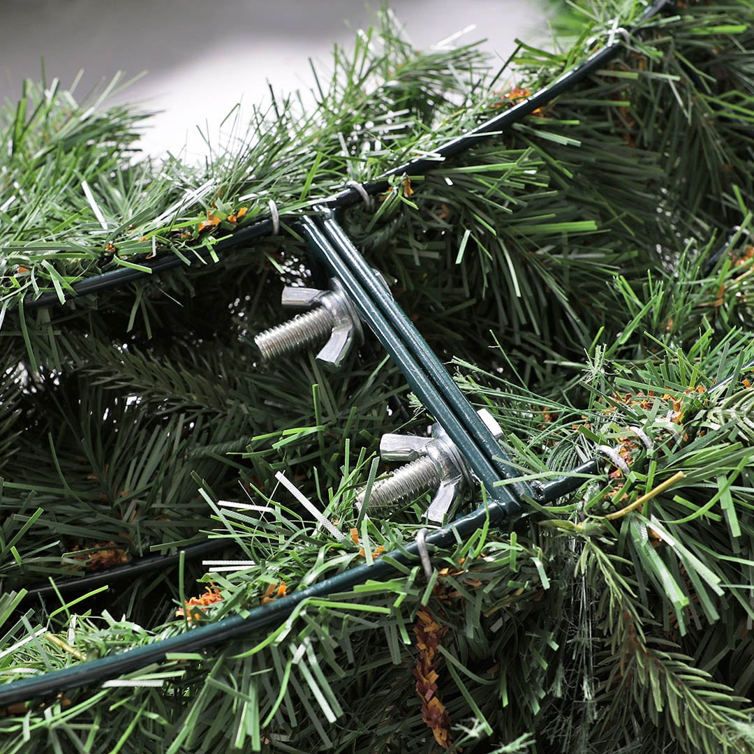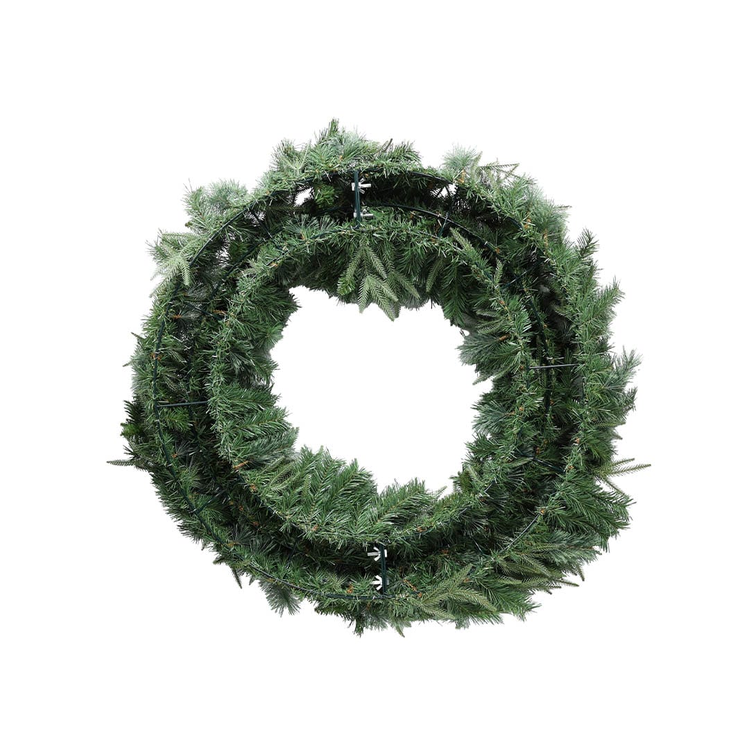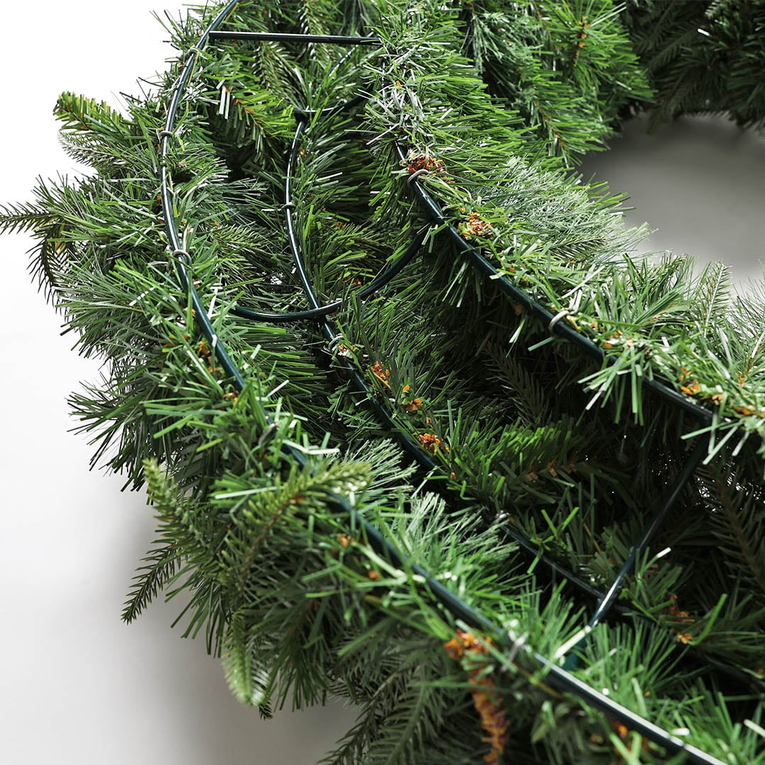 存在感抜群の大型リース。 タフで安定性の高いスチールワイヤーフレームに、軽量でリアルな質感のプラスチックリーフをたっぷり施しました。 組み立て式なので、省スペースで保管でき、設置や撤去も簡単。 ショップや商業施設、イベント会場などの装飾に最適です。 ライトやオーナメント、リボンなどを追加してホリデーシーズンならではの空間演出をお愉しみください。