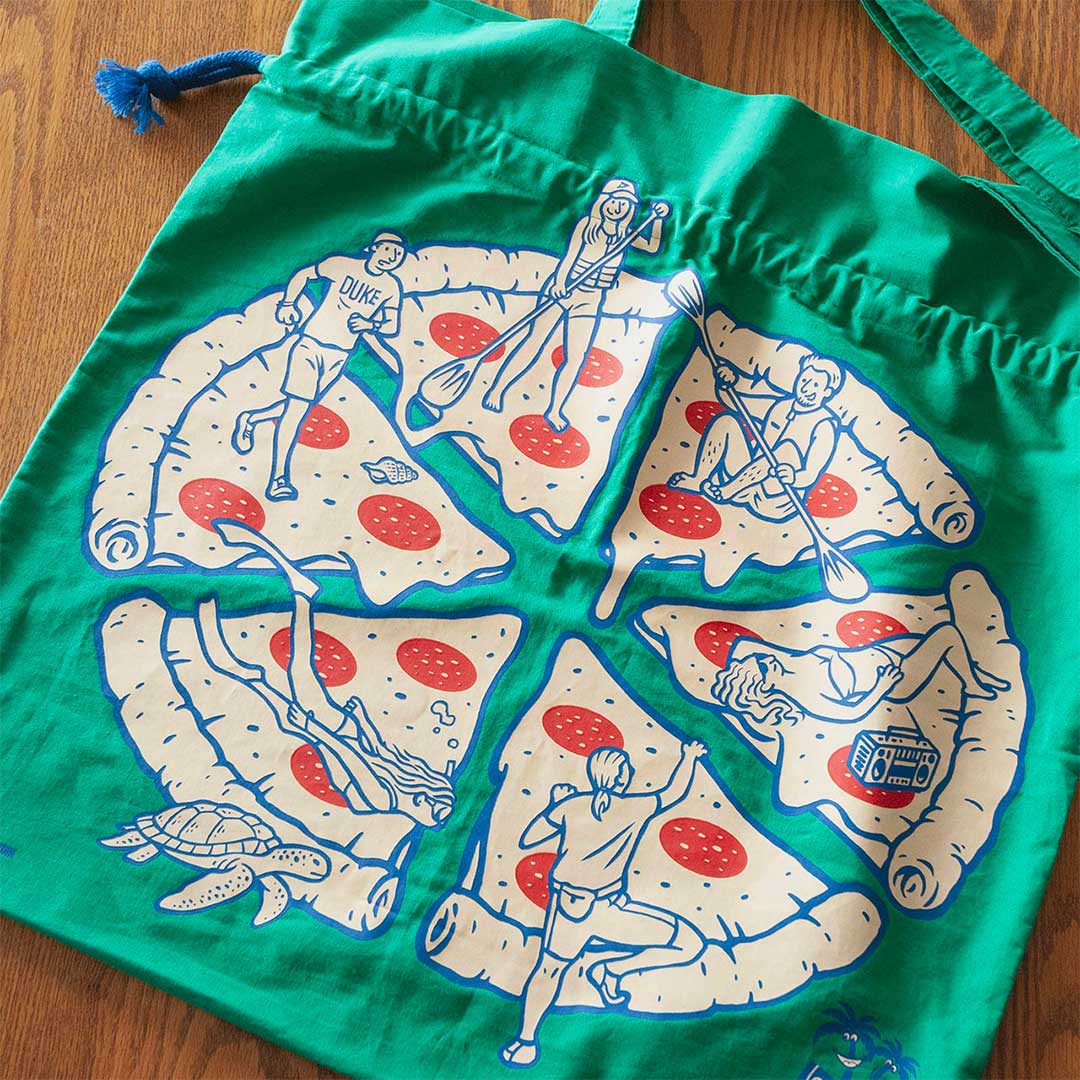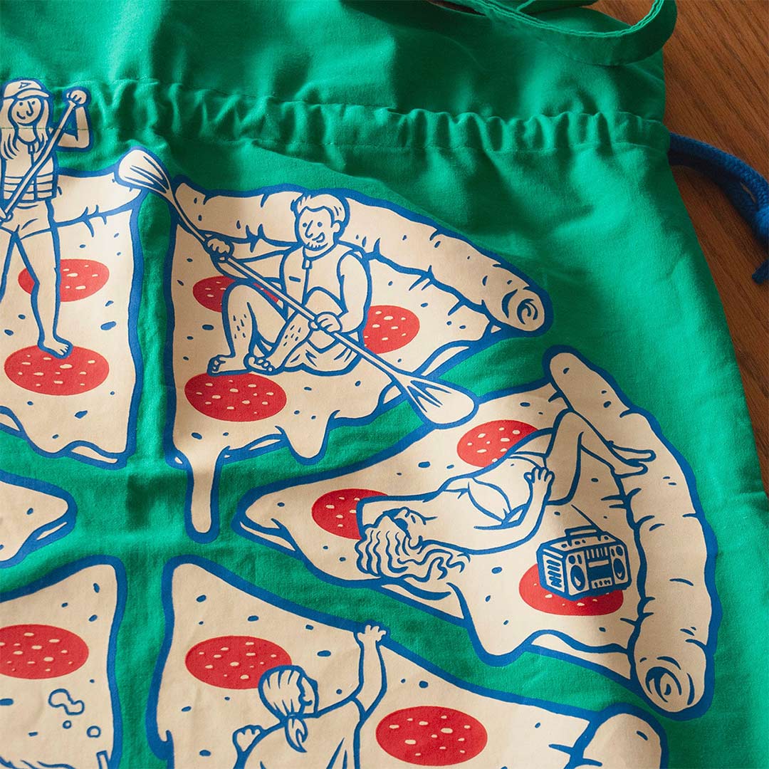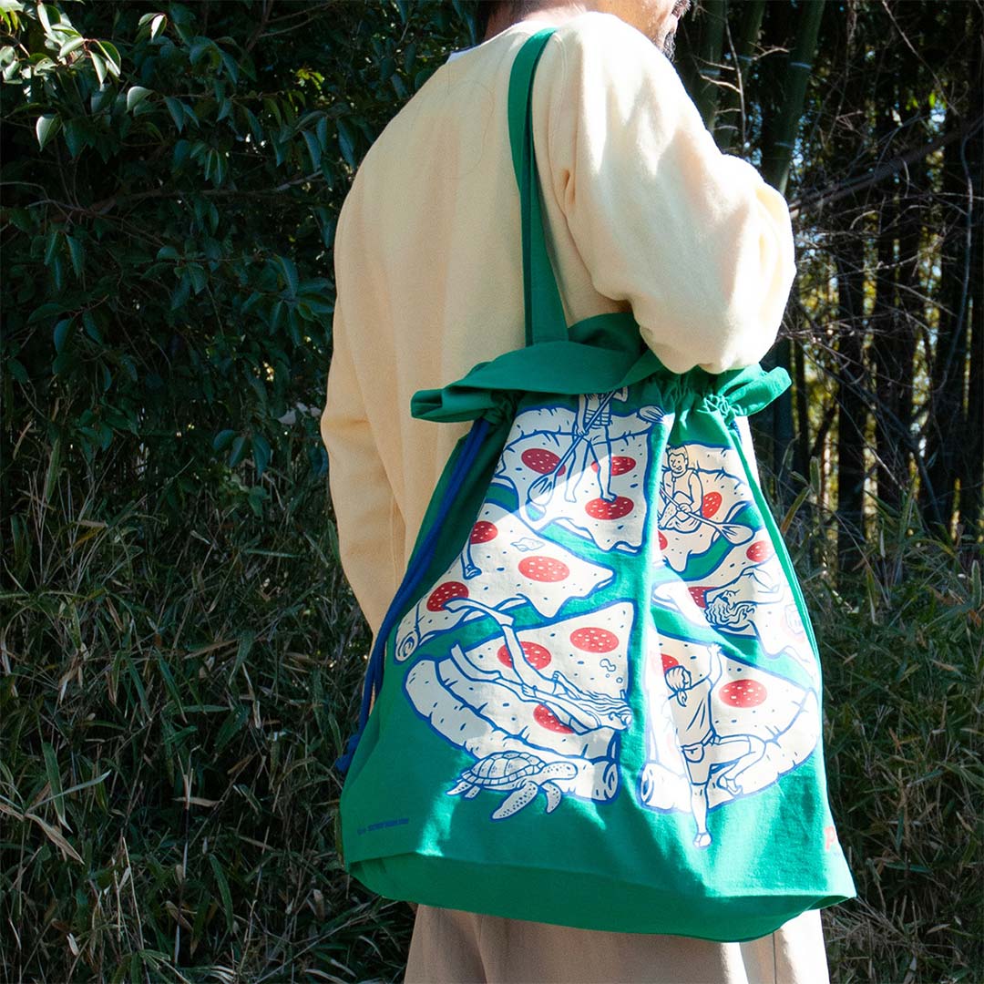 DAILYCHOP DESIGN STORE(デイリーチョップ デザインストア)のアートワークを落とし込んだ大きめサイズのマルシェバッグ。リュックや車の中に1枚入れておくと、重宝するお買い物袋です。袋部分のサイズは500×500mm。マチ付きで大容量です。旅行トランクの中の衣類の仕分けなど、巾着袋としての使い方もおすすめ。