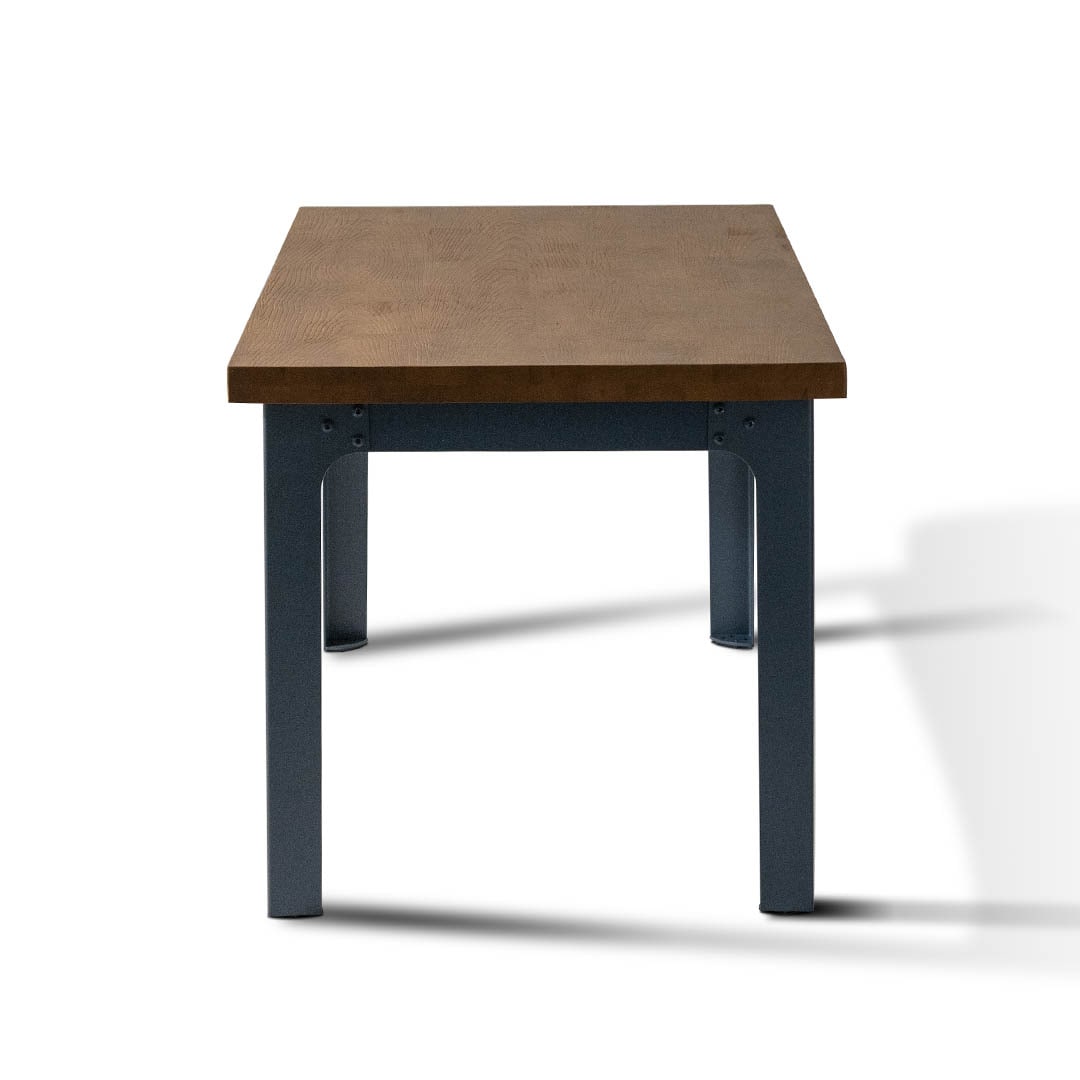 天板には温もりと風合いを感じられるラバーウッドの無垢材を使用。天然木が持つ自然な表情をそのまま愉しめます。脚部にはマット塗装のスチールを採用。木と金属、それぞれの質感が引き立て合い、調和した一台です。