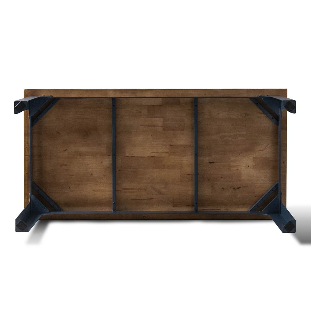 天板はどっしりと厚みがありつつも、滑らかな手触りで安定した使い心地。コーナーや接合部に施されたリベットデザインのボルトが、インダストリアルな個性をプラスします。