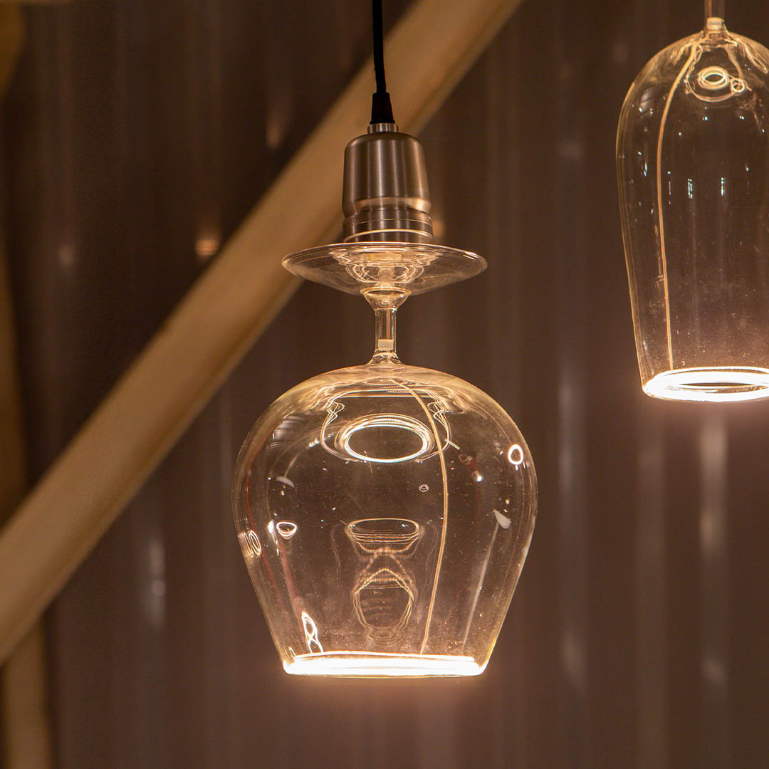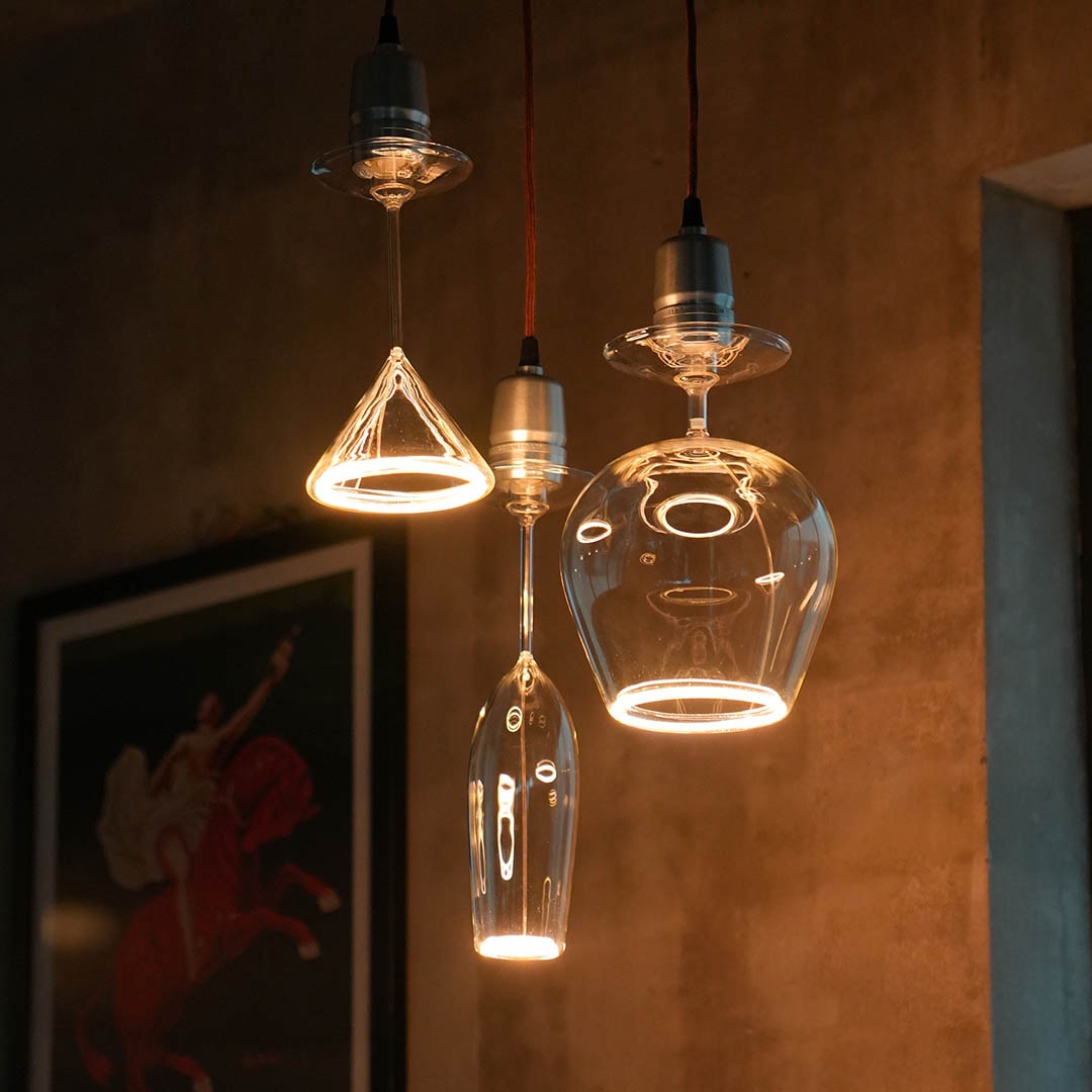 飲み口が光るブランデーグラス型のLED電球。 明かりを灯すとグラス全体のシルエットが幻想的に浮かび上がります。 バーカウンターやダイニングに並べて吊るしても明るくなりすぎず、個性的ながらも落ち着いた雰囲気を演出。 遊び心と上品さを併せ持ち、空間に居合わせる人の心を掴みます。