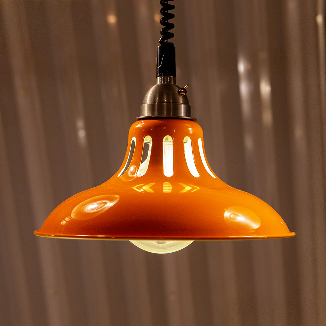 コードのテンションを自在に調整できるペンダントランプ。 リールが内蔵されている為、その場その場でスムーズに高さを変えることができます。 ソケットカバーのトグルスイッチでON/OFF操作も可能。 コードを伸縮させたり、スイッチを入れたりと、アナログな動作の中にある心地よさに気付かされます。 無骨なスチールシェードは、ワークテイストはもちろん、カジュアルな空間にもマッチ。 機能性とデザイン性を両立した照明です。