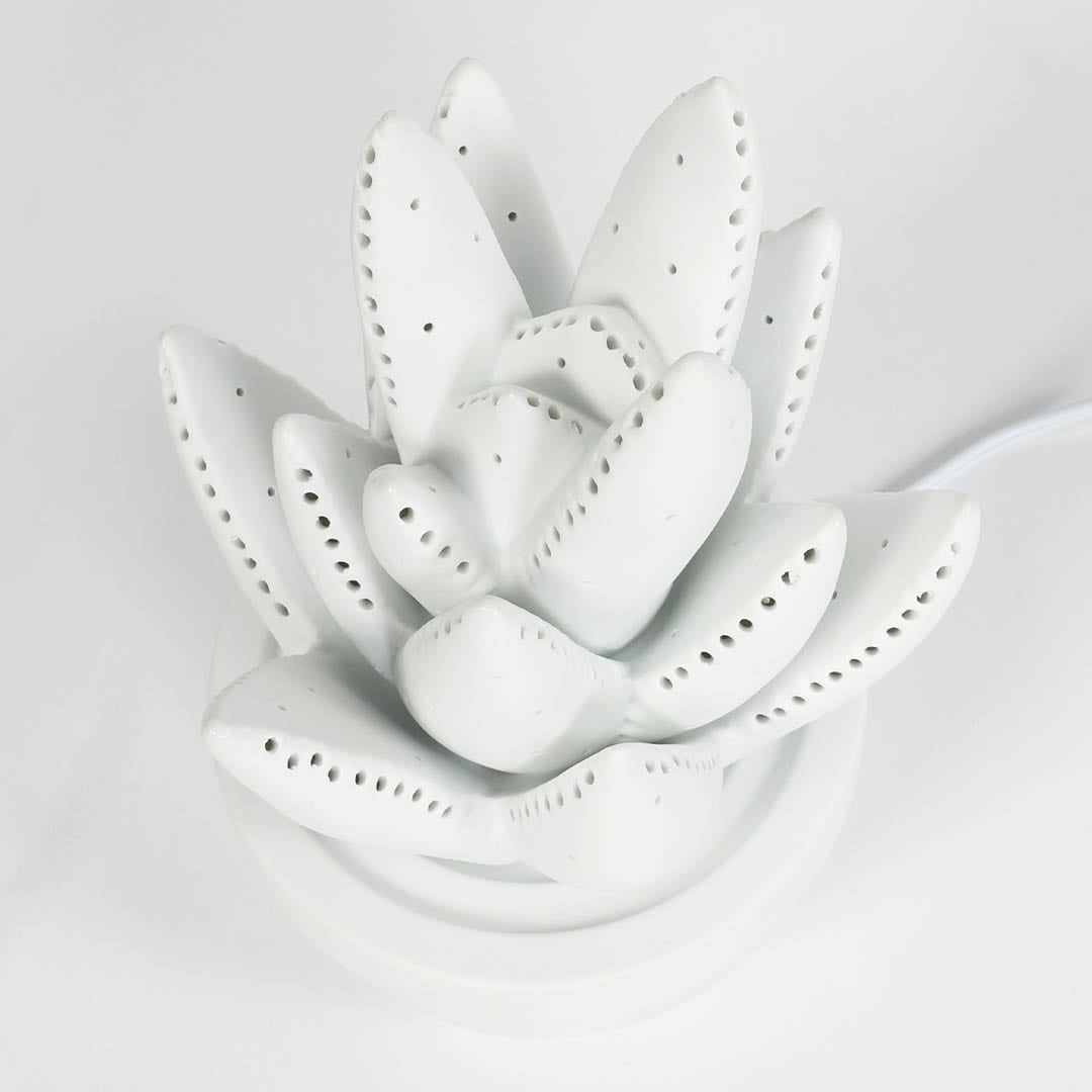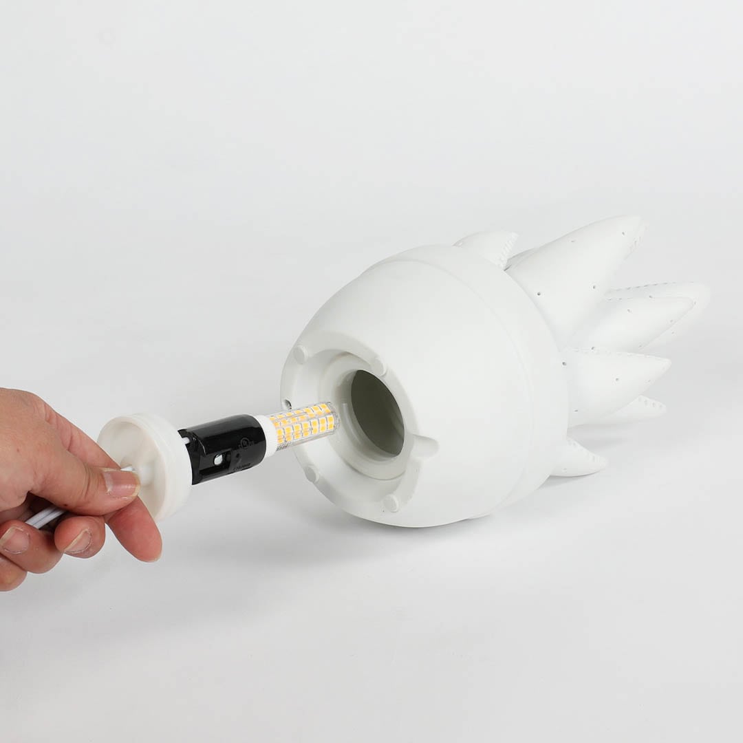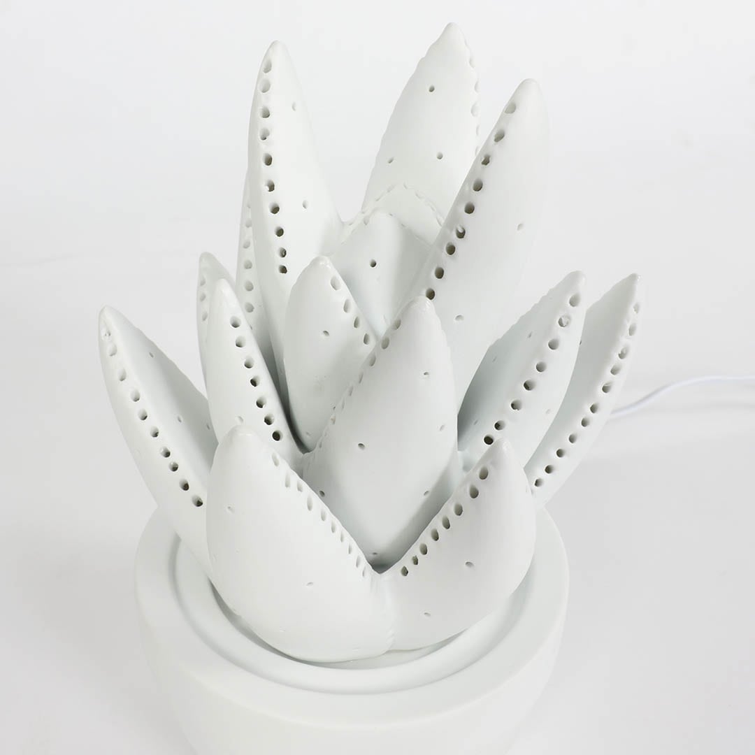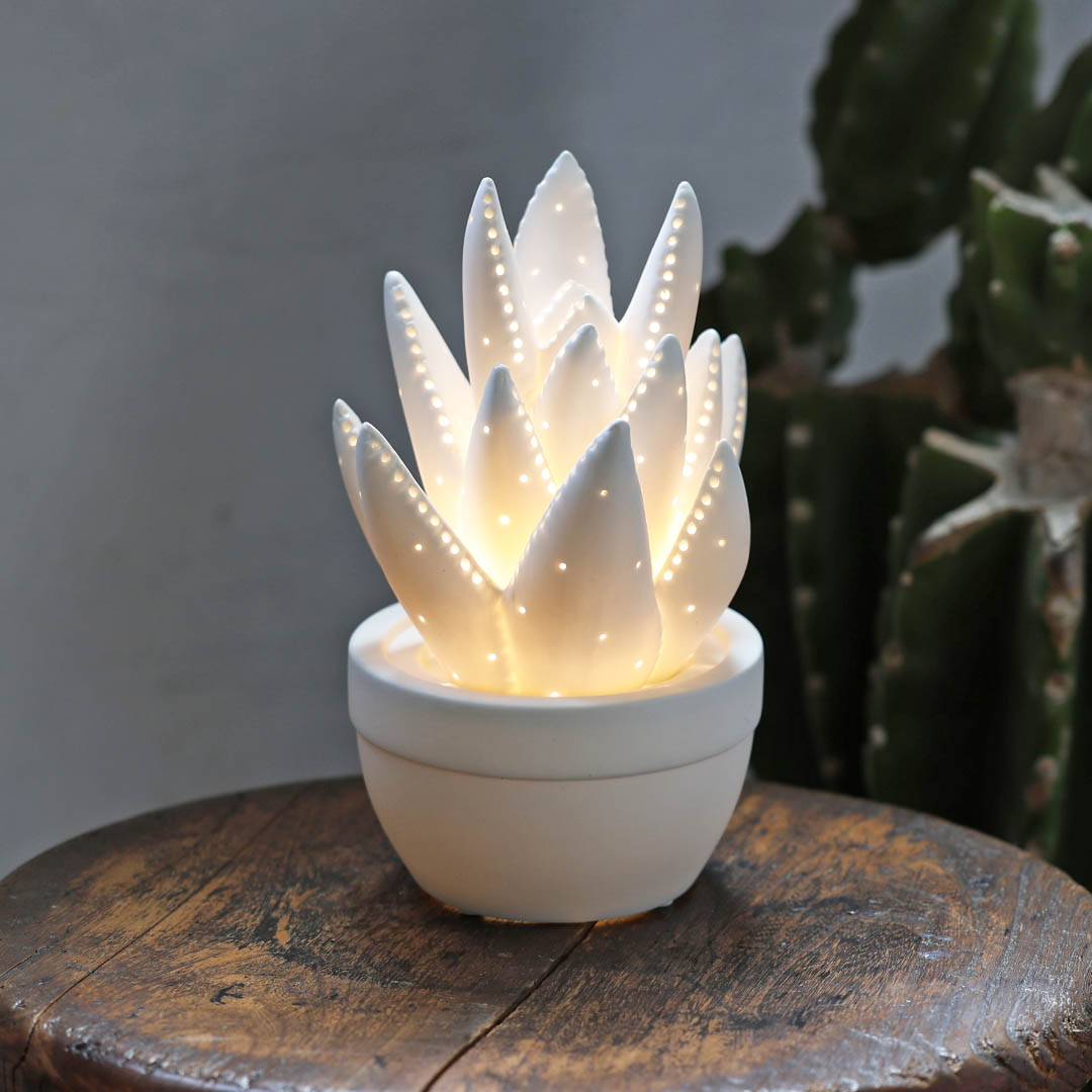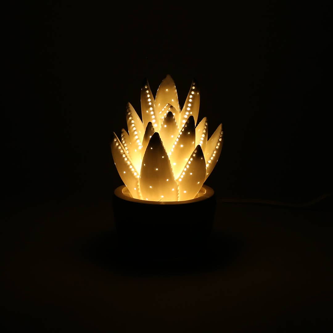 子ども部屋や書斎の片隅に、相棒として置いておきたいアロエ型ランプ。 模様を描くように空いた穴は、少しいびつで、素朴な佇まいが憎めません。 スイッチをONにすると、中からぼんやりと光が漏れ、控えめながらも暗闇で自らの居場所を主張。 育つことも枯れることも無く、健気に日常を照らします。決して機能的な照明器具とは言い張れませんが、どこか愛嬌ある姿に気持ちも明るくなります。