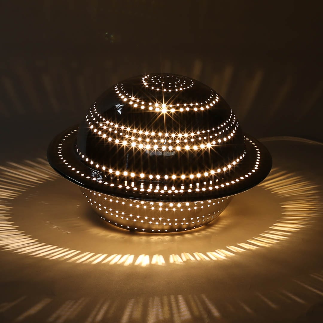 子ども部屋や書斎の片隅に、相棒として置いておきたい土星型ランプ。 模様を描くように空いた穴は、少しいびつで、素朴な佇まいが憎めません。 スイッチをONにすると、中からぼんやりと光が漏れ、控えめながらも暗闇で自らの居場所を主張。 幻想的な光が空間に小さな宇宙を映し出します。決して機能的な照明器具とは言い張れませんが、どこか愛嬌ある姿に気持ちも明るくなります。