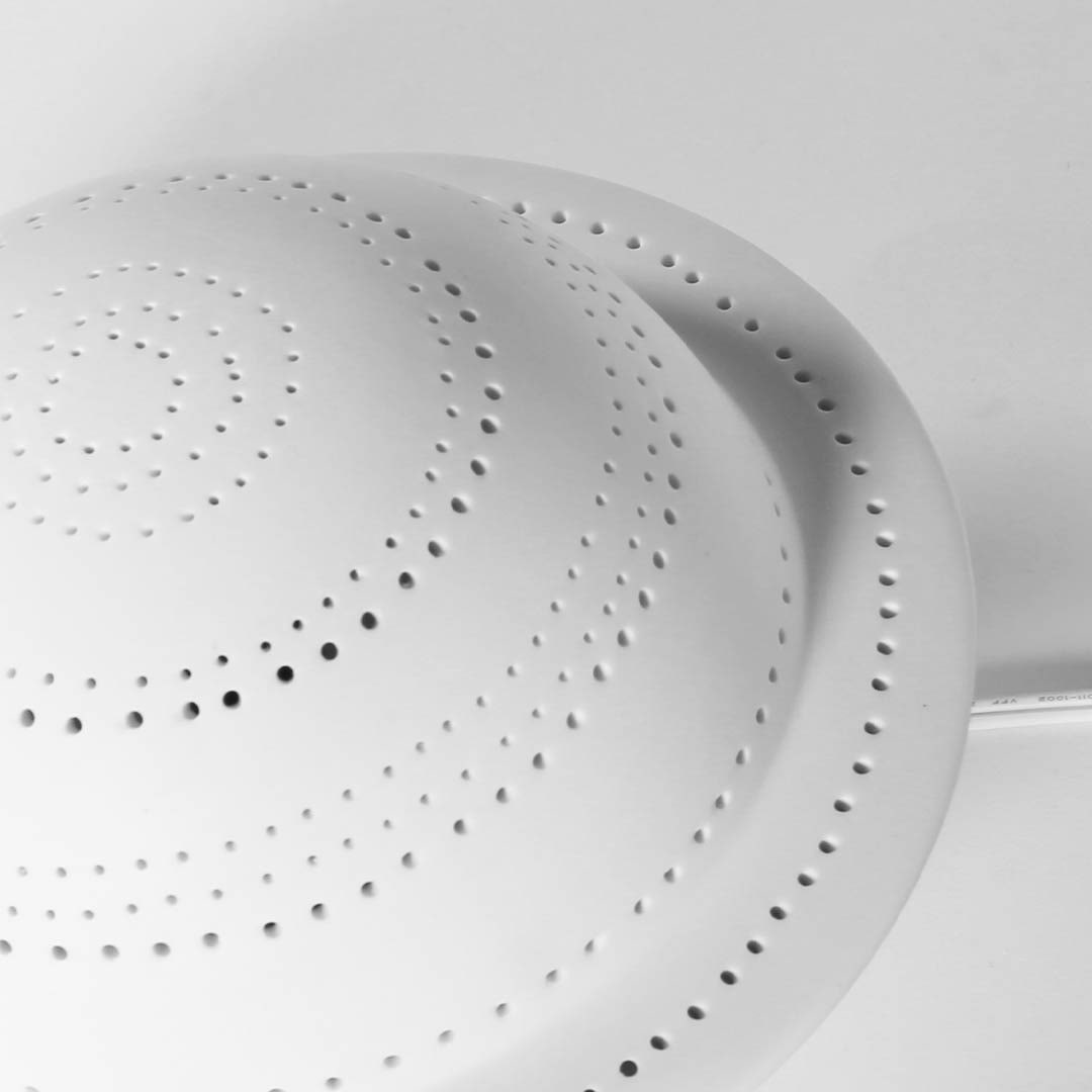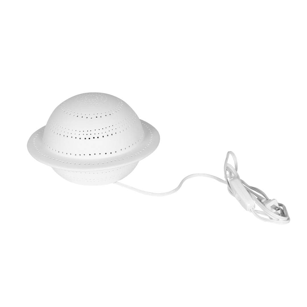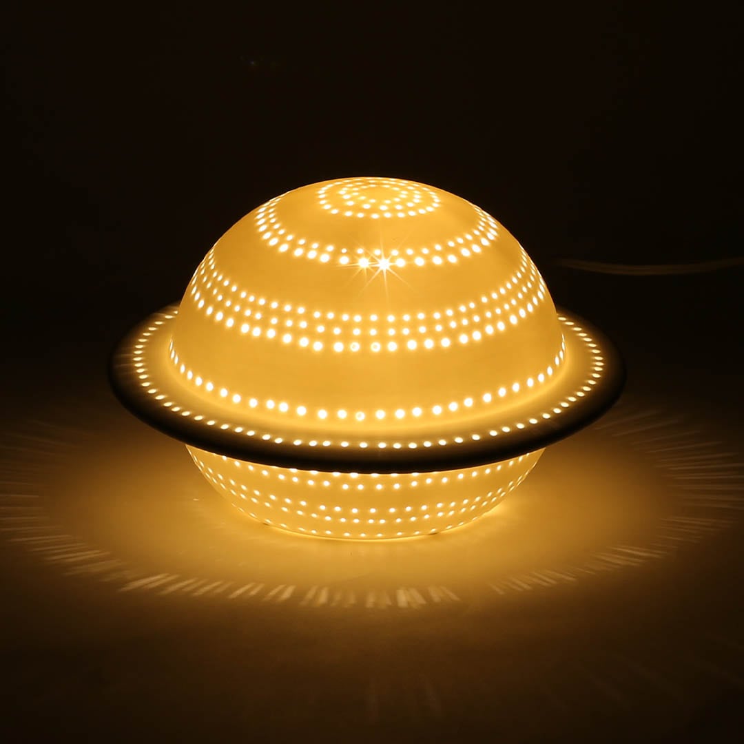 子ども部屋や書斎の片隅に、相棒として置いておきたい土星型ランプ。 模様を描くように空いた穴は、少しいびつで、素朴な佇まいが憎めません。 スイッチをONにすると、中からぼんやりと光が漏れ、控えめながらも暗闇で自らの居場所を主張。 幻想的な光が、空間に小さな宇宙を映し出します。 決して機能的な照明器具とは言い張れませんが、どこか愛嬌ある姿に気持ちも明るくなります。