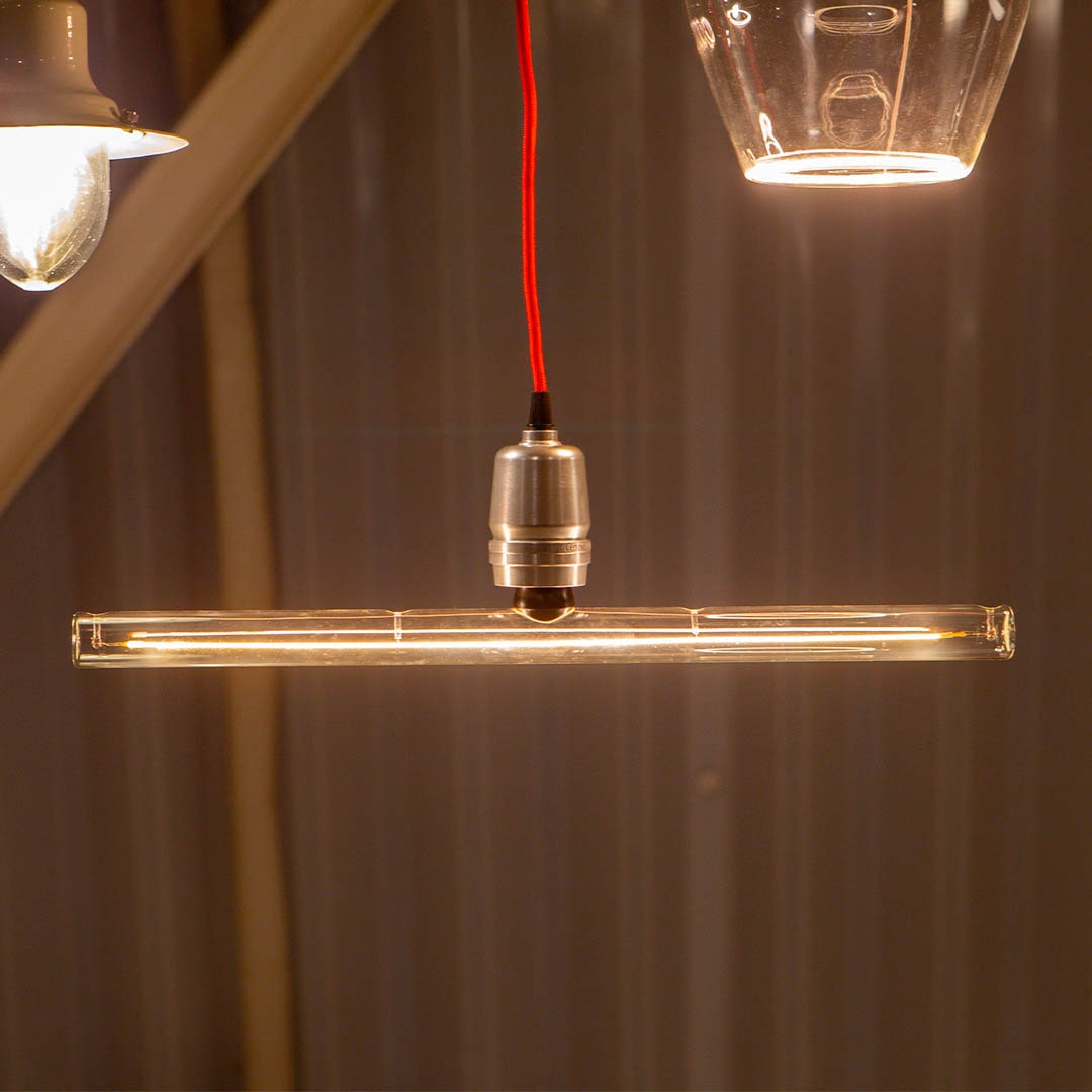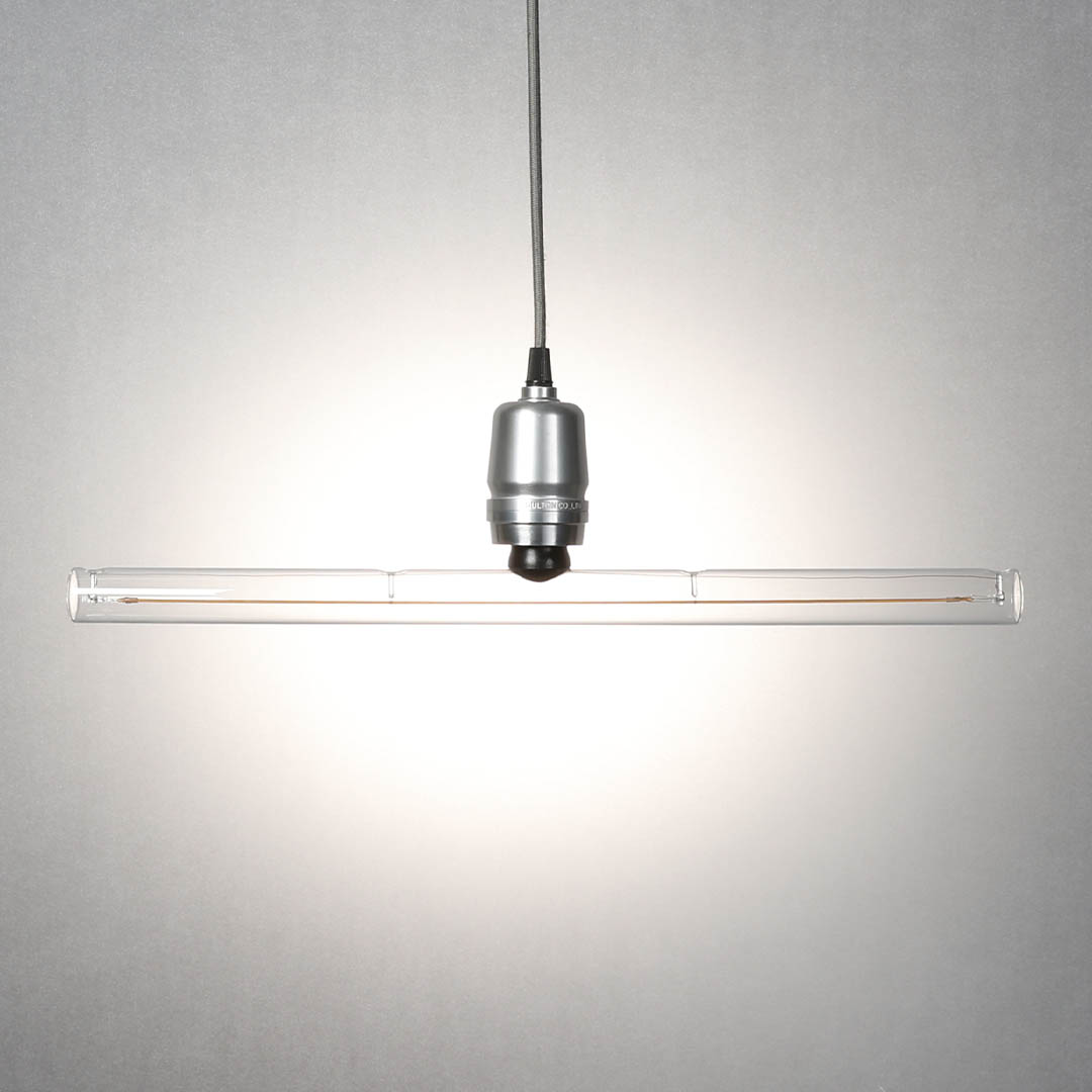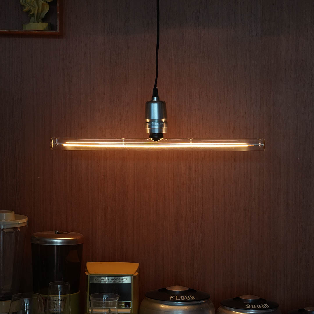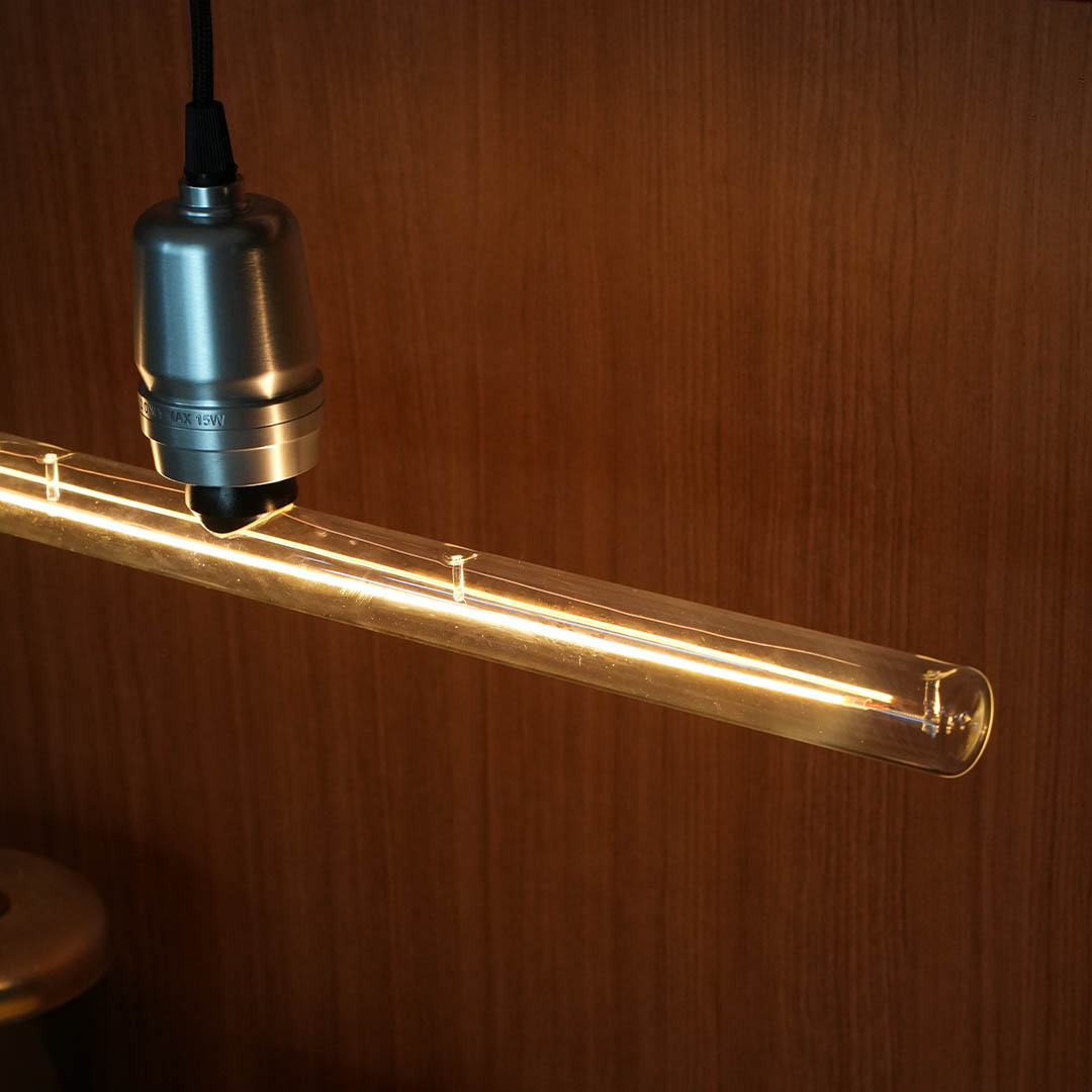 一本の灯が空間を引き締める横長のLED電球。蛍光灯のような水平の灯を、一般的なソケット(口金E26)に取り付けるだけで手軽に実現できます。本体は約120°回転し、狙った方向へ安定して配光可能。ガラスの素材感を活かした、飾りすぎないデザインも魅力です。キッチンやカウンター、ショップなど、道具感のある空間にしっくり馴染む一灯です。