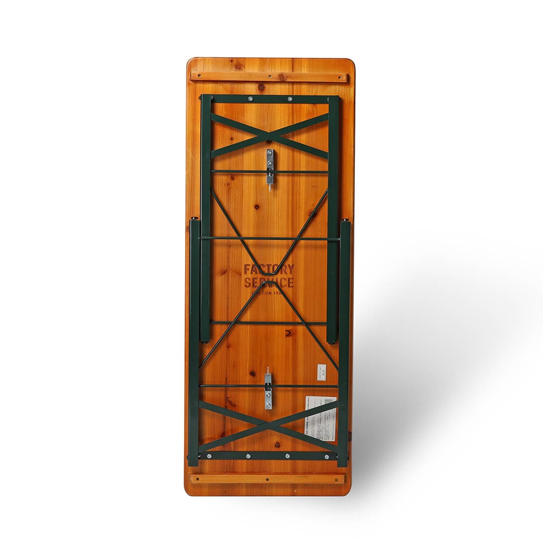 海外の古き良き時代を思わせるカジュアルテイストのテーブル。休日に思いつきで家族とガーデンランチを楽しんだり、ガレージで昔馴染みの友人とビールを飲み交わしたり。脚が折り畳めるデザインなので、お部屋への移動も楽チン。屋内外を問わず、心地よい場所で心地よいひと時を過ごせます。裏面にレーザー刻印で施したロゴも味わい深い。