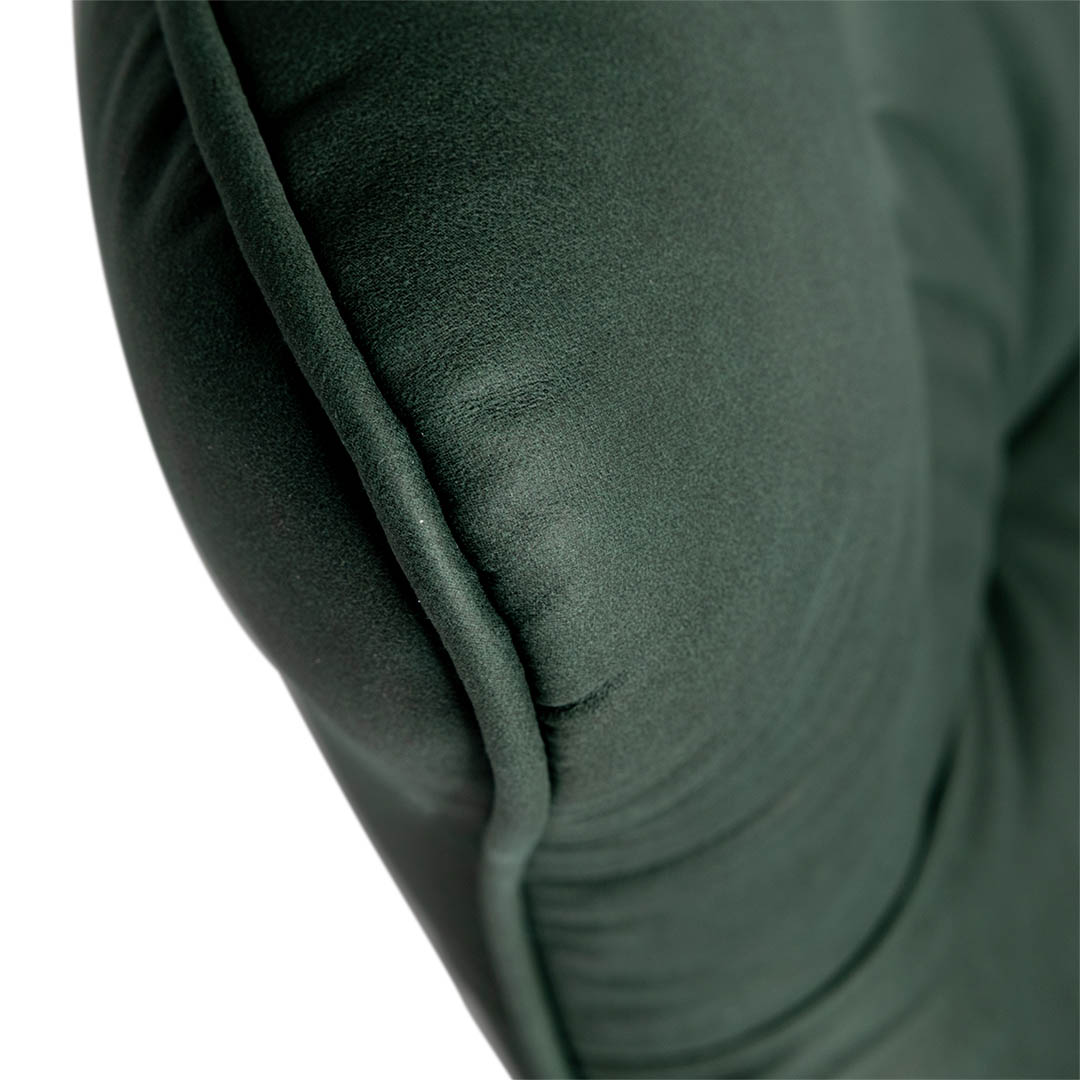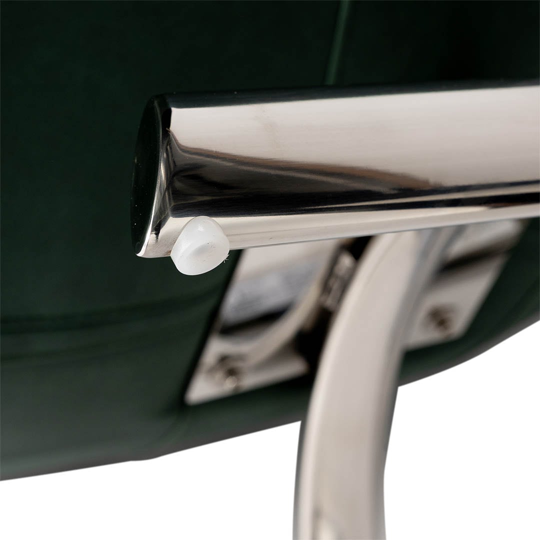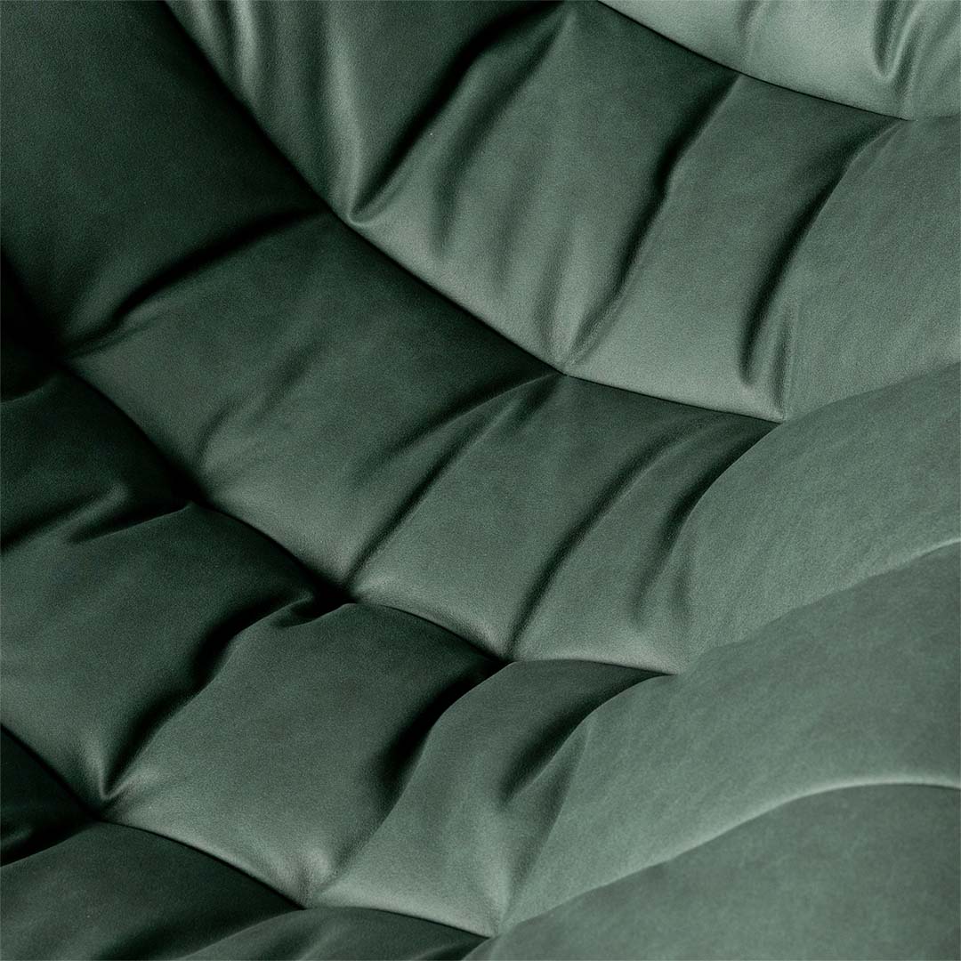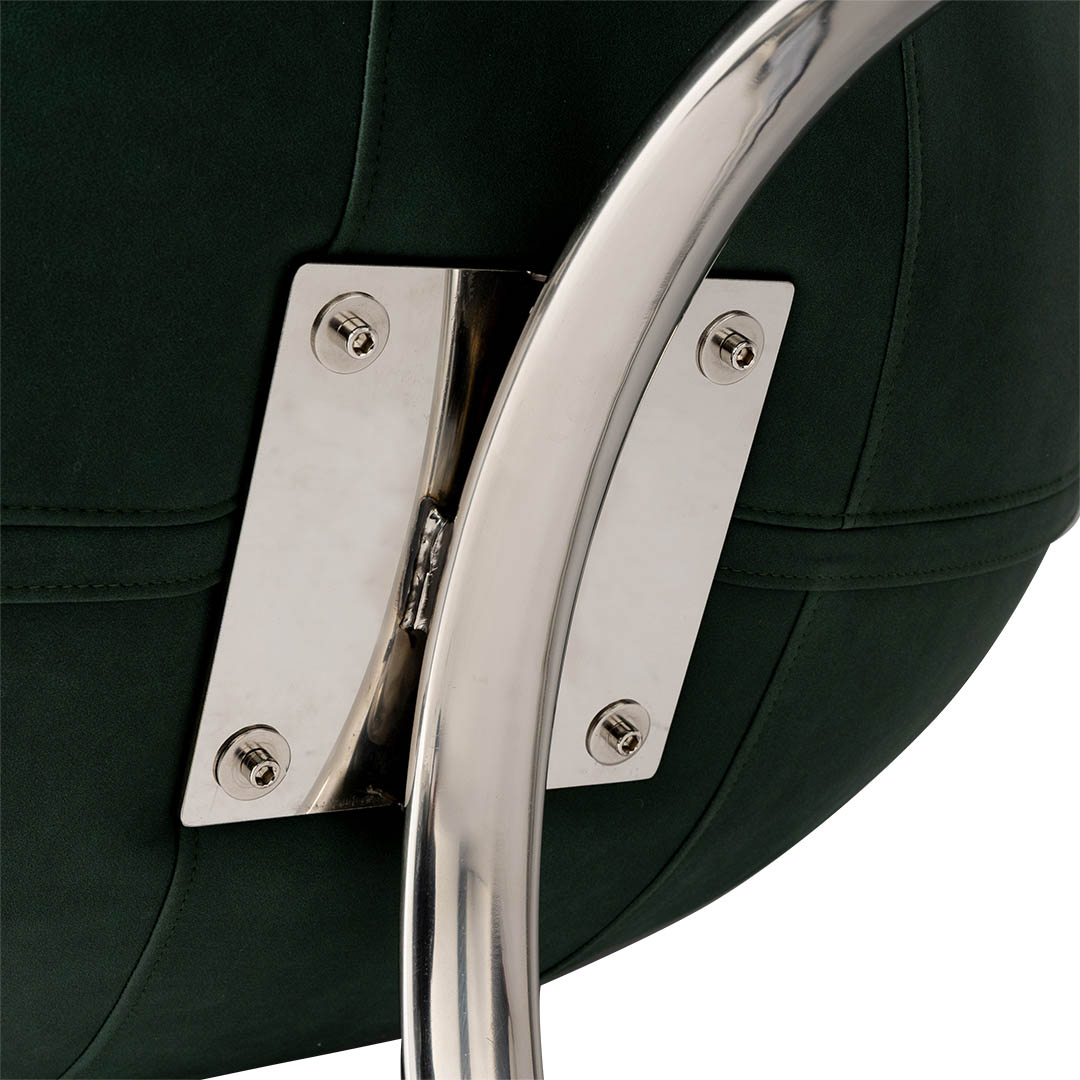 深みのあるエメラルドグリーンが映えるラウンジチェア。 弧を描くステンレスの脚部とゆったり広々とした一体型シートの組み合わせが印象的。 ソファほど大きくなく、椅子よりゆったりとくつろげる、心地良いサイズ感です。 ひとたび腰を下ろせば、チェア全体が身体を優しく包み込みます。 読書やコーヒーブレイク、リビングでのリラックスタイムに。 いつもの空間を特別な場所にしてくれる一脚です。