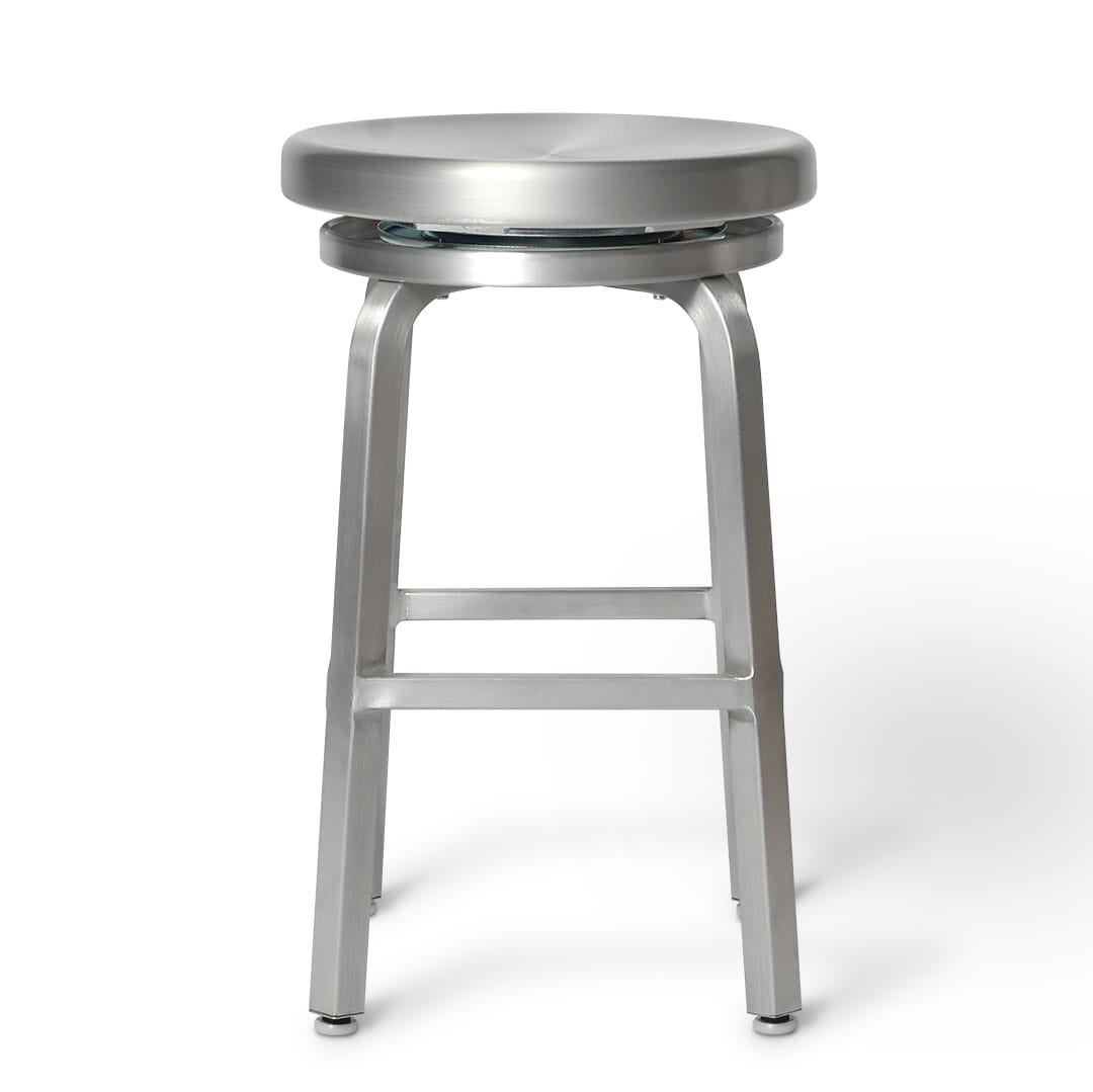 軽くて丈夫なアルミ製スツール。アルミの質感と無骨さを生かしつつ、シンプルで実用的なデザインです。 直径37.5cmの広々とした座面は、安定性に優れ、体の向きを自由に変えられる回転式なので、ストレスフリーな座り心地。 キッチン・ダイニングから、ガレージ、ベランダやテラスなど、様々な場所で愛用したい。 扱いやすくインテリアにも馴染むラウンドスツールは、お店や商業施設でも活躍します。