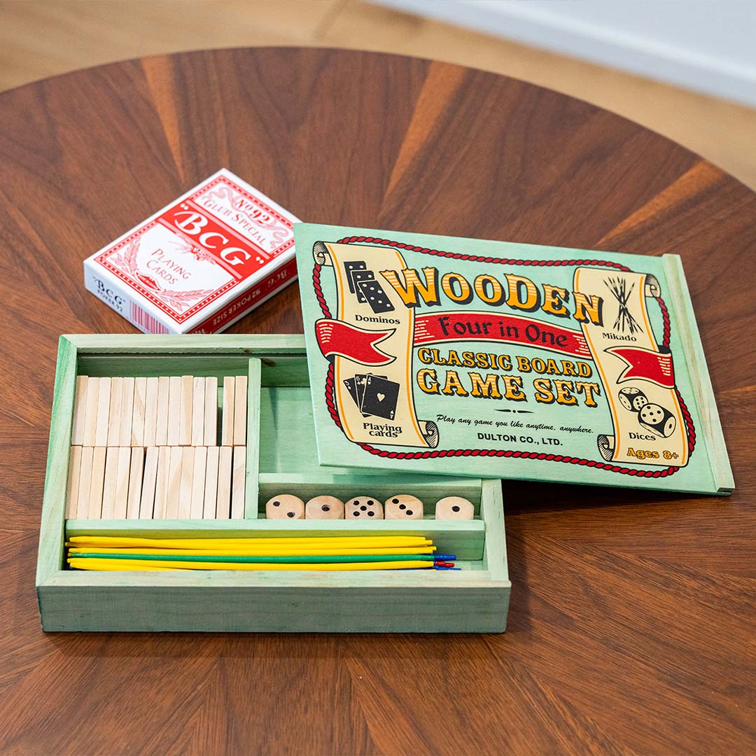 4種類のボードゲームが収められたレトロなゲームセット。 すべてアナログだからこそ味わえる駆け引きと、どこか懐かしい手触りや風合いに魅了されます。 オリジナルデザインを施した木箱は、バーカウンターやリビングに置いておくだけで絵になる存在感。 ウイスキーやコーヒーを片手に、仲間との時間をお愉しみください。