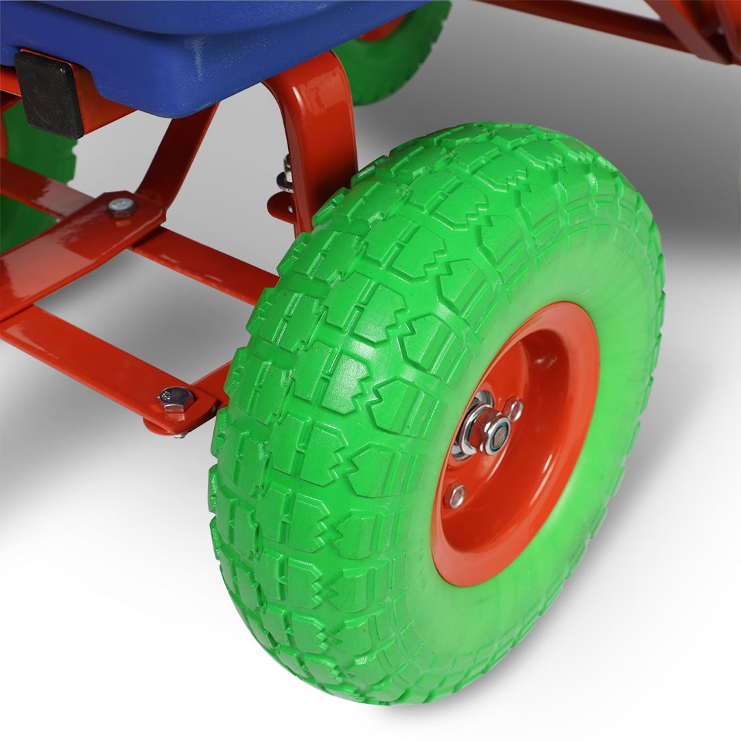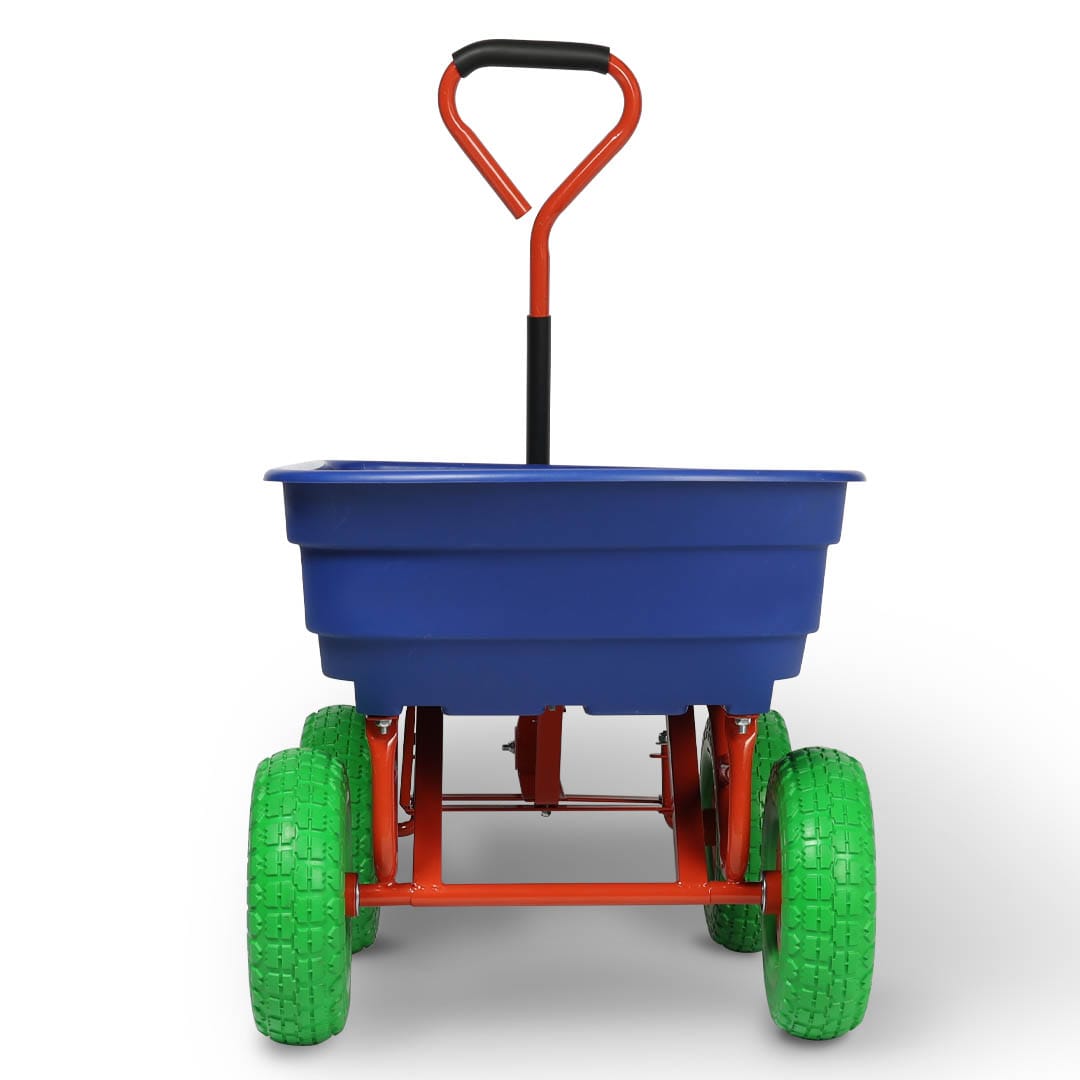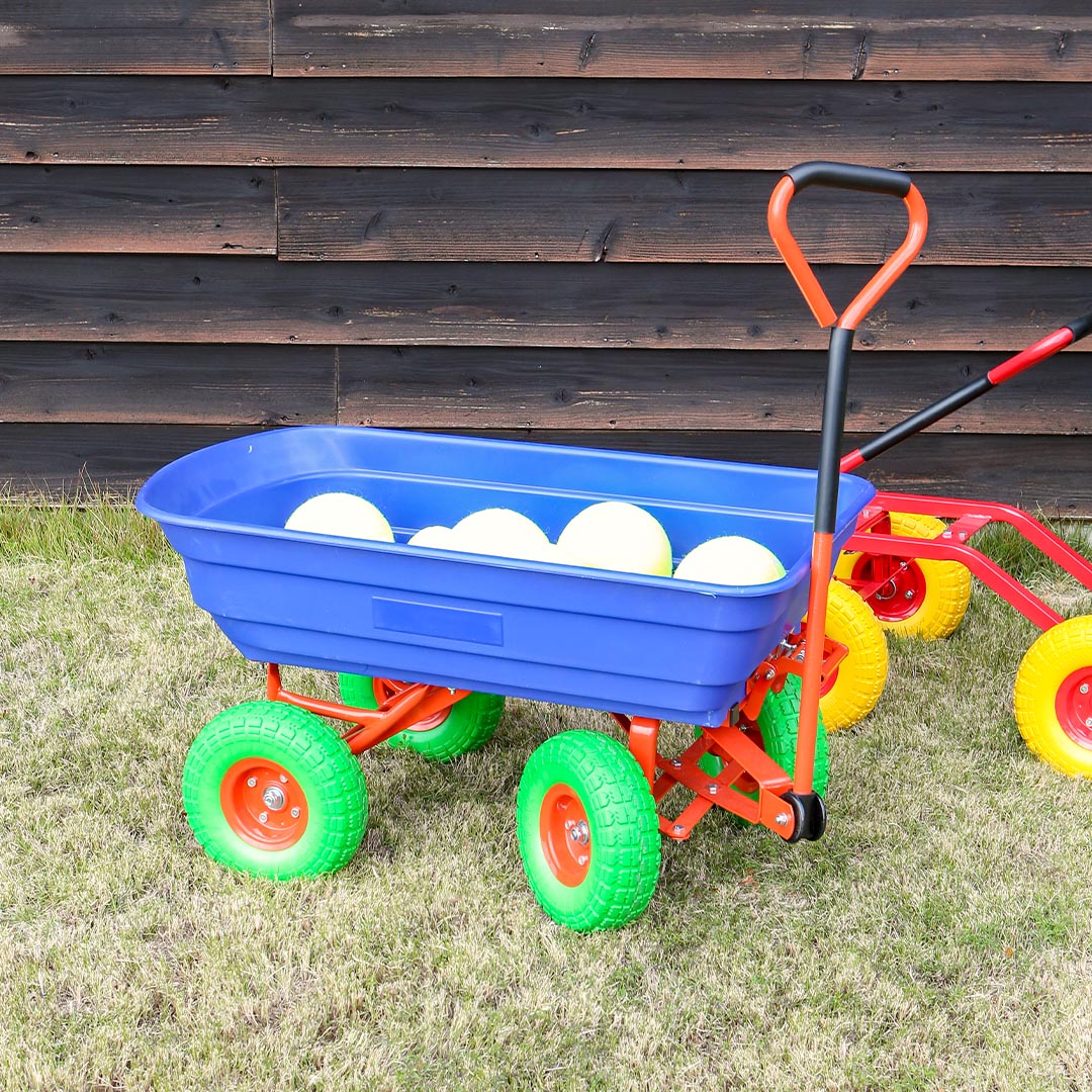 芝生に映えるポップカラーのダンプカート
