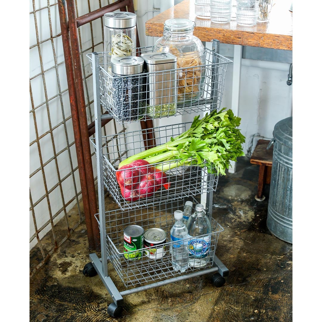 バスケットが縦に3段並んだ使い勝手の良いキャスター付きワイヤーラック。 固定式のバスケットの間はそれぞれ13cm程の隙間があるので、大小様々なものを収納可能。 すっきりとしたデザインは、キッチン周りからリビングまで場所を選ばずご使用いただけます。キャスター付きで手軽に移動できるので、ホームパーティーやべランディング等ちょっとしたイベント時の助っ人としても大活躍。 長く使っていく中で傷や汚れは付き物ですが、たとえ付いても目立ちづらい、ハンマートンの凹凸塗装仕上げも魅力的。 オレンジのCAUTION(注意喚起)ステッカーもそのまま活かしたい。