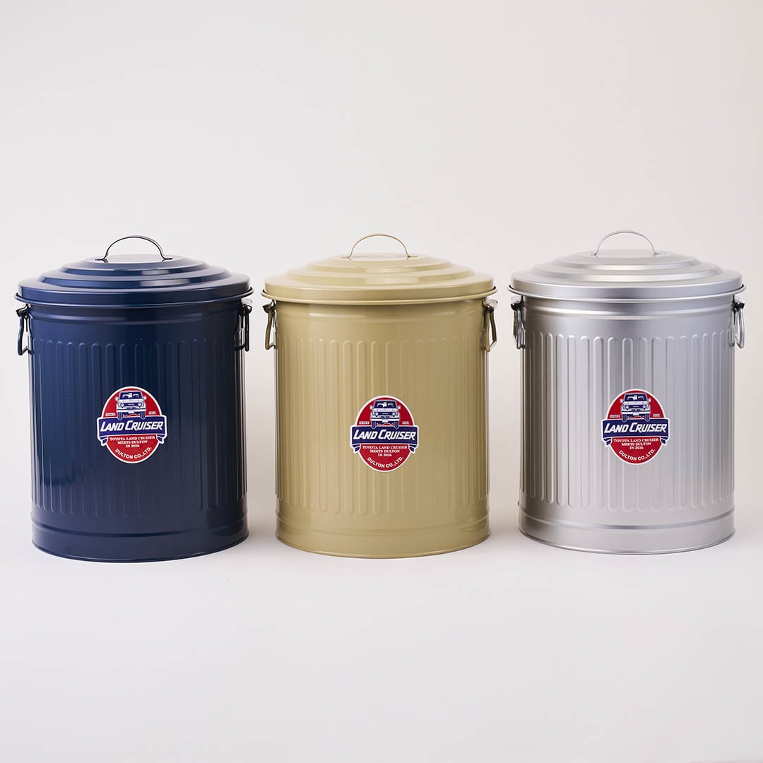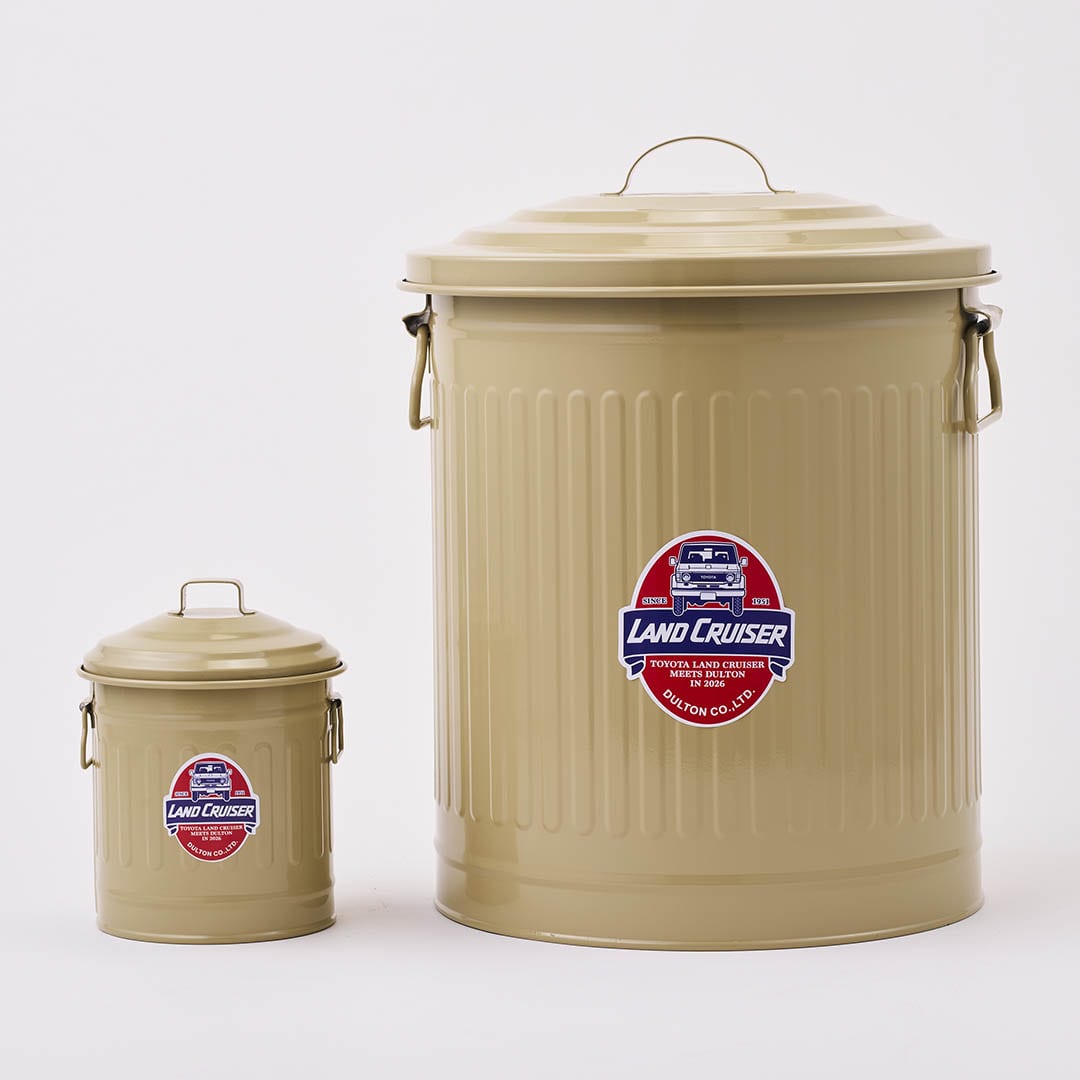 <DULTONの不朽のロングセラーアイテムを、無骨でポップなランドクルーザー特別仕様にしたガベージカン>ダルトンで長年愛され続けるガベージカン。ひと抱えくらいの12Lサイズなので、ごみ箱としての用途の他、日用雑貨や食料品のストック入れや掃除用具の収納としてなど、マルチに活躍するダルトンを代表するプロダクトです。プロダクトの顔となる中央のステッカーは元々のデザインをオマージュしつつ、ダルトン創業年である1988年にランドクルーザーカタログの表紙を飾った“70 WAGON”でデザイン。本コラボレーションのシグネチャーとなるエンブレムの1つになっています。本体カラーは、ランドクルーザー“70”シリーズに採用されてきた車体カラーを忠実に再現した別注色、「LC Beige」「LC Blue」「LC Silver」の3色展開。