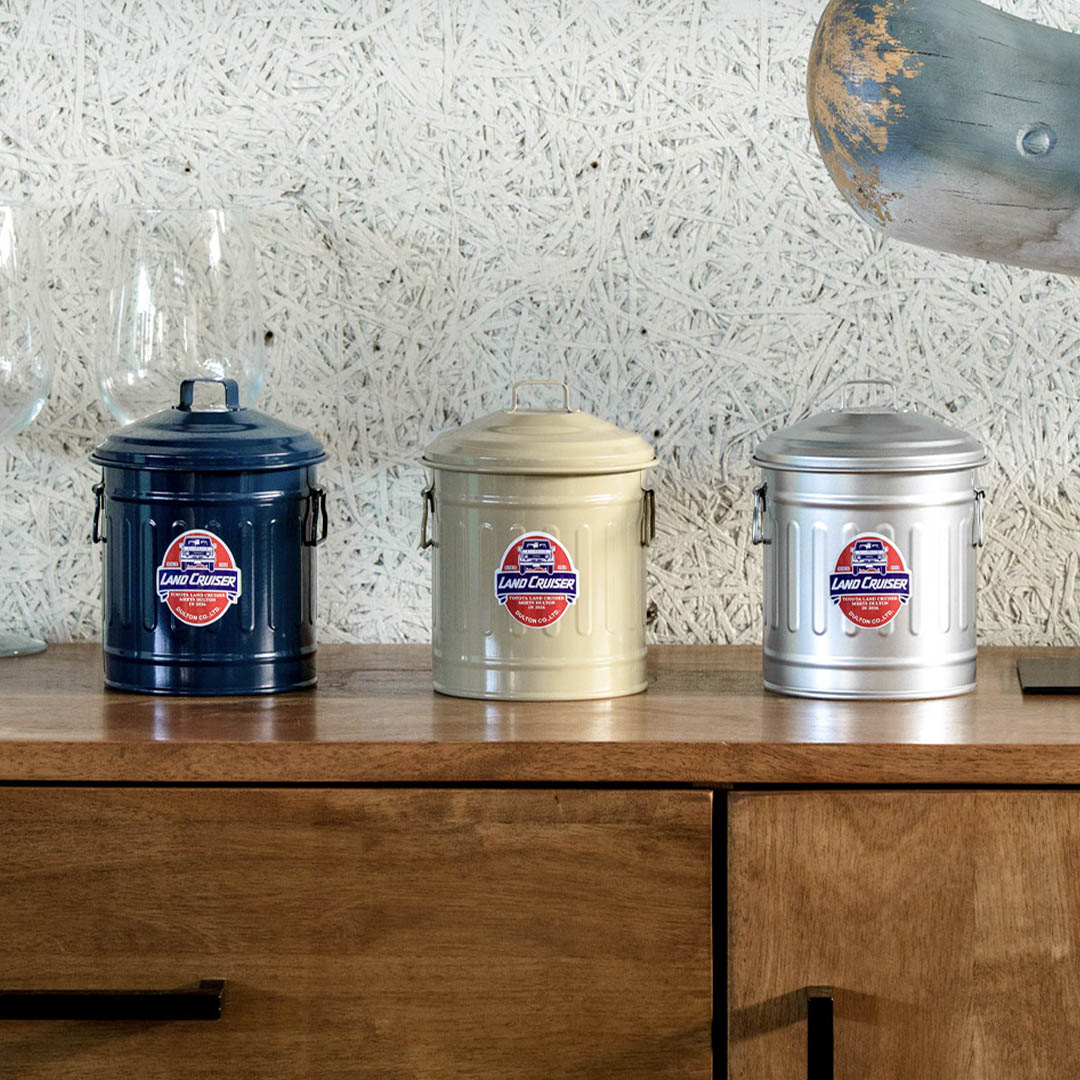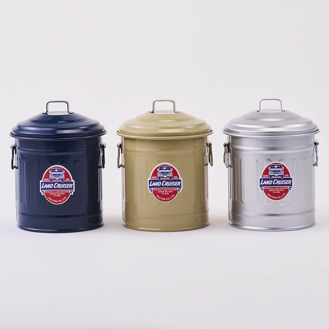 <DULTONの不朽のロングセラーアイテムの卓上サイズ。無骨でポップなランドクルーザー特別仕様にしたベビーガベージカン>ダルトンで長年愛され続けるガベージカンシリーズの卓上サイズ。キッチンではゴミ箱に、机の上では文具立てや小物入れに、どこでも使える小さいガベージカンです。プロダクトの顔となる中央のステッカーは元々のデザインをオマージュしつつ、ダルトン創業年である1988年にランドクルーザーカタログの表紙を飾った“70 WAGON”でデザイン。本コラボレーションのキーとなるエンブレムになっています。本体カラーは、ランドクルーザー“70”シリーズに採用されてきた車体カラーを忠実に再現した別注色、「LC Beige」「LC Blue」「LC Silver」の3色展開。