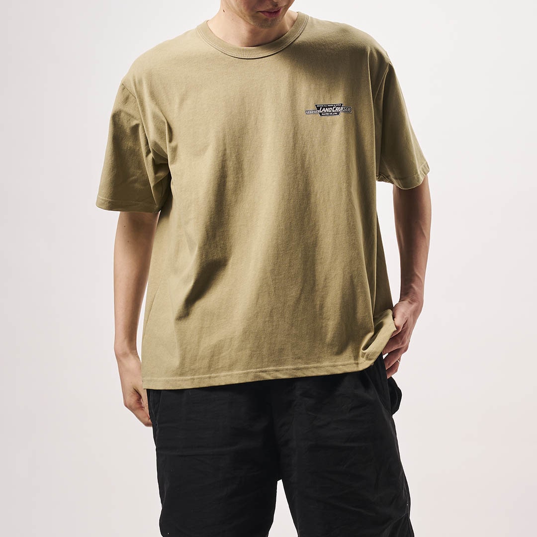 <サインプレートのデザインをTシャツに落とした一着。本コラボレーションのシグネチャーカラーをイメージしたカラー展開>サインプレートのデザインをバックに配した半袖Tシャツ。フロントに入れたワンポイントのコラボロゴは、厚盛りのラバープリントで立体感のある仕上がりに。Tシャツのボディ色は、今回のシグネチャーカラーであるランドクルーザー“70”シリーズ塗装色の3色に近いカラーリングに、サインプレートのイメージをそのまま落としたモスグリーンを加えた全4種展開。これまでのLAND CRUISER OFFICIAL ITEMSと同じく、首リブには丈夫なバインダーネックを採用しています。