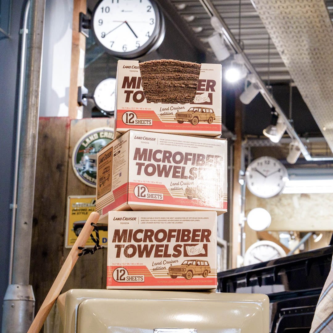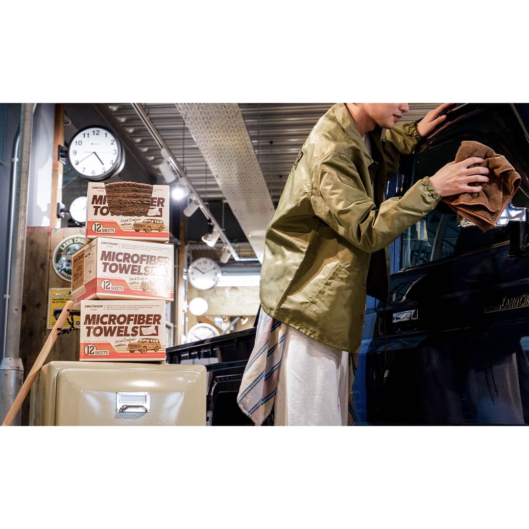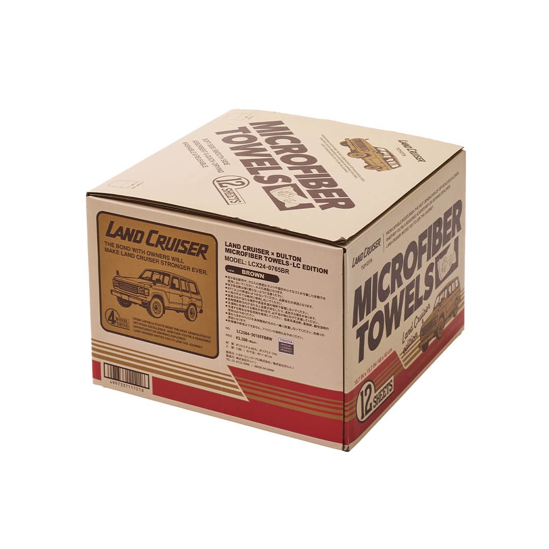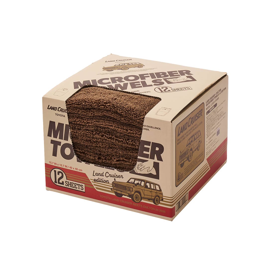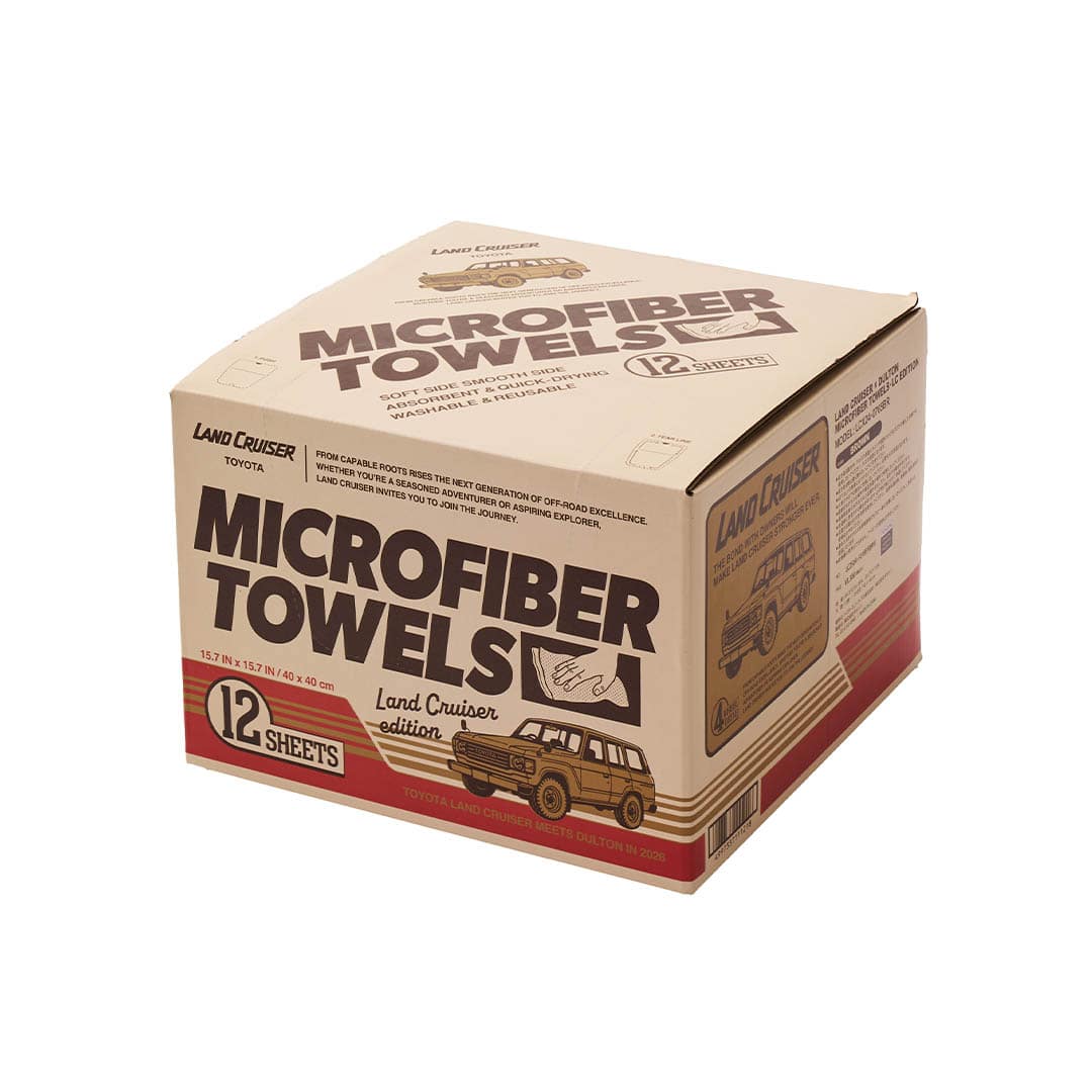 <レトロなオリジナルデザインボックスが魅力の、掃除にも洗車にも便利な厚織りのマイクロファイバータオル12枚セット>随所にランドクルーザーのモチーフを散りばめた遊び心あるレトロな雰囲気のボックスデザイン。中には、家の掃除はもちろん、車内のメンテナンスや洗車後の拭き上げにも重宝する厚手の大判マイクロファイバータオルが12枚入っています。タオルは40×40cmの大判サイズなので、掃除やカーメンテナンスの際にも一枚でしっかり活躍してくれます。ボックスのデザインは1980年発売の”初期60”をモチーフに、当時のサイドデカールや、4WDエンブレムをオマージュ。時代背景も合わせたレトロな雰囲気の中に、ランドクルーザーらしいデザインが落とし込まれています。