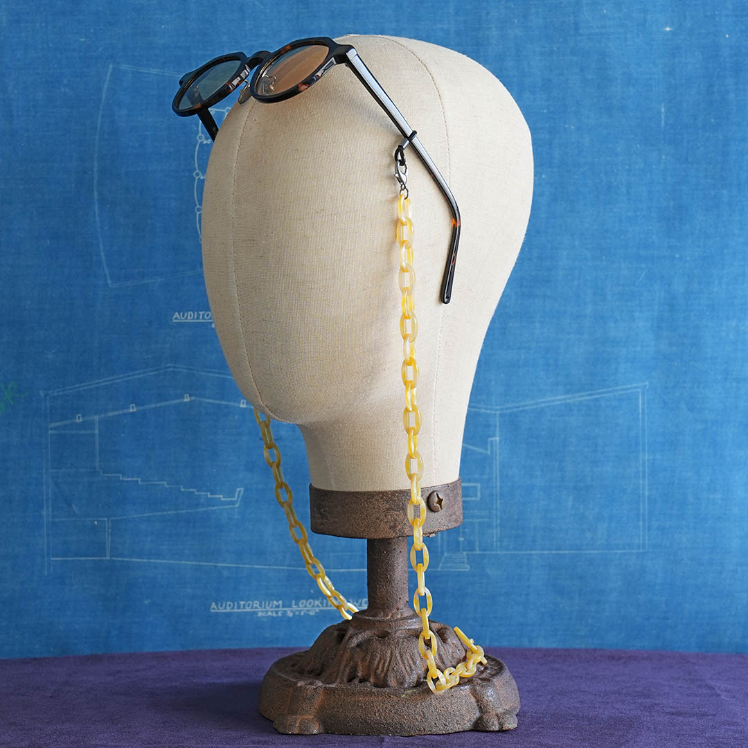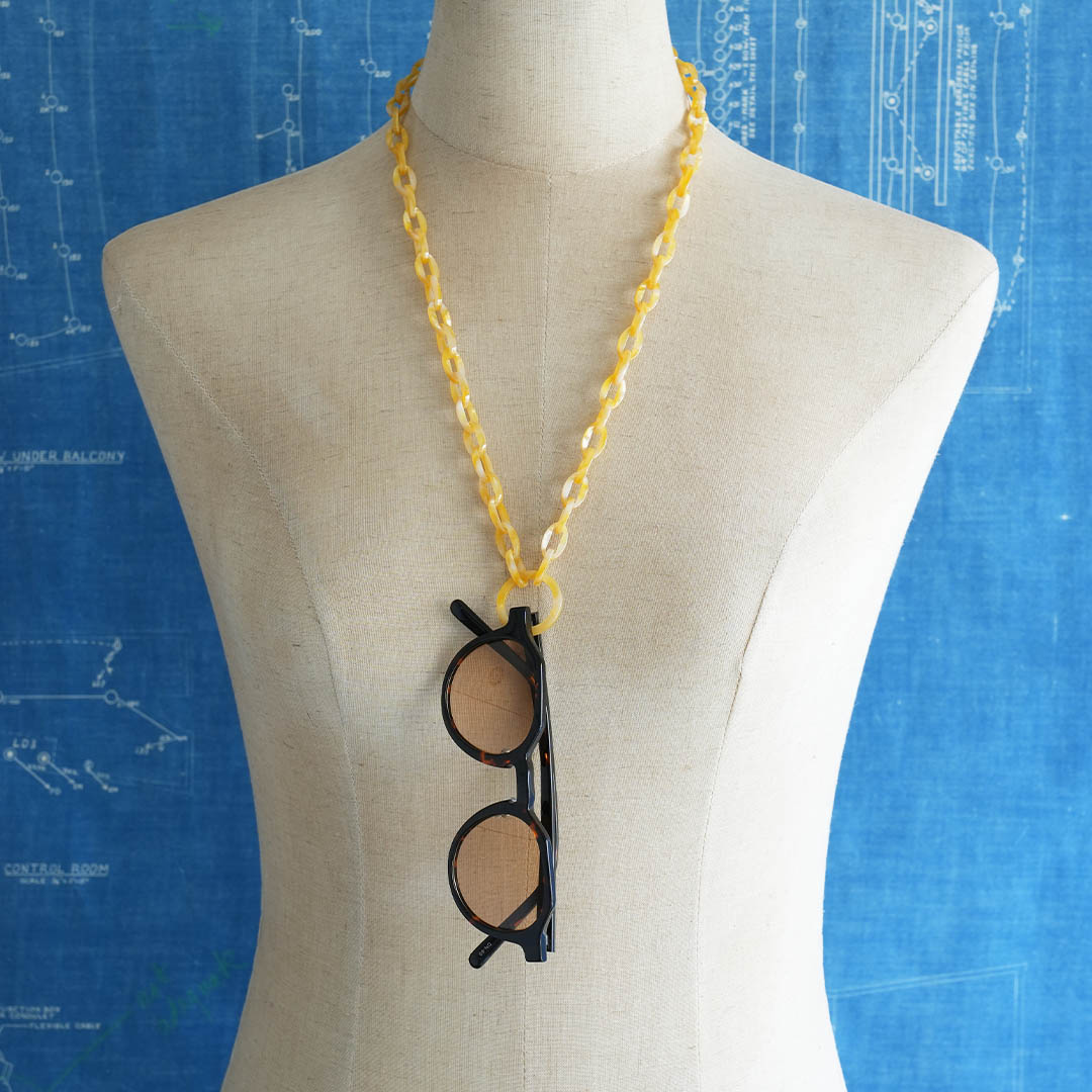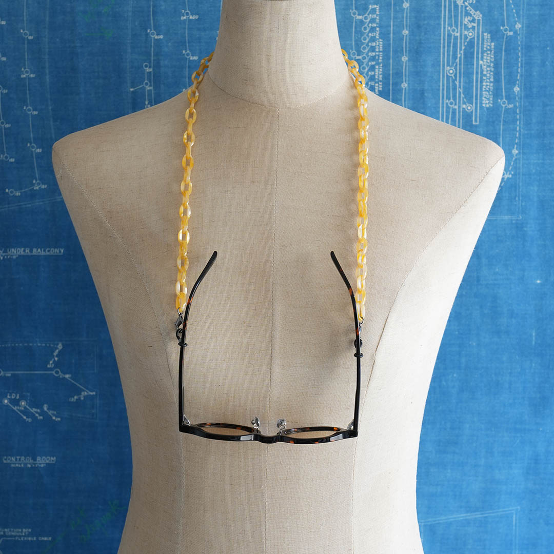 ■材質の特性上、リングの接合箇所に線が見える場合がございます。予めご了承ください。■アセテートは高温多湿の環境下では変形しやすい特性があります。車内や直射日光の当たる場所を避けて保管してください。■アセテートは植物由来のセルロースを原料とした素材ですが、製品の一部に金属パーツを使用しています。金属アレルギー等で肌に合わない場合は直ちにご使用をおやめください。■ハンドメイドの製造工程上、色や柄、 形状・サイズに若干の個体差がございます。■衣服や毛髪に引っかかる可能性がございますのでご注意ください。■使用を続けていく中で、経年劣化による破損が見られた際はご使用をおやめください。■強い力で引っ張るとチェーンが破損する可能性がございます。■メガネの形状によってはご使用いただけないものもございます。■本製品は眼鏡用です。ただし、眼鏡を完全に固定するものではありません。備考