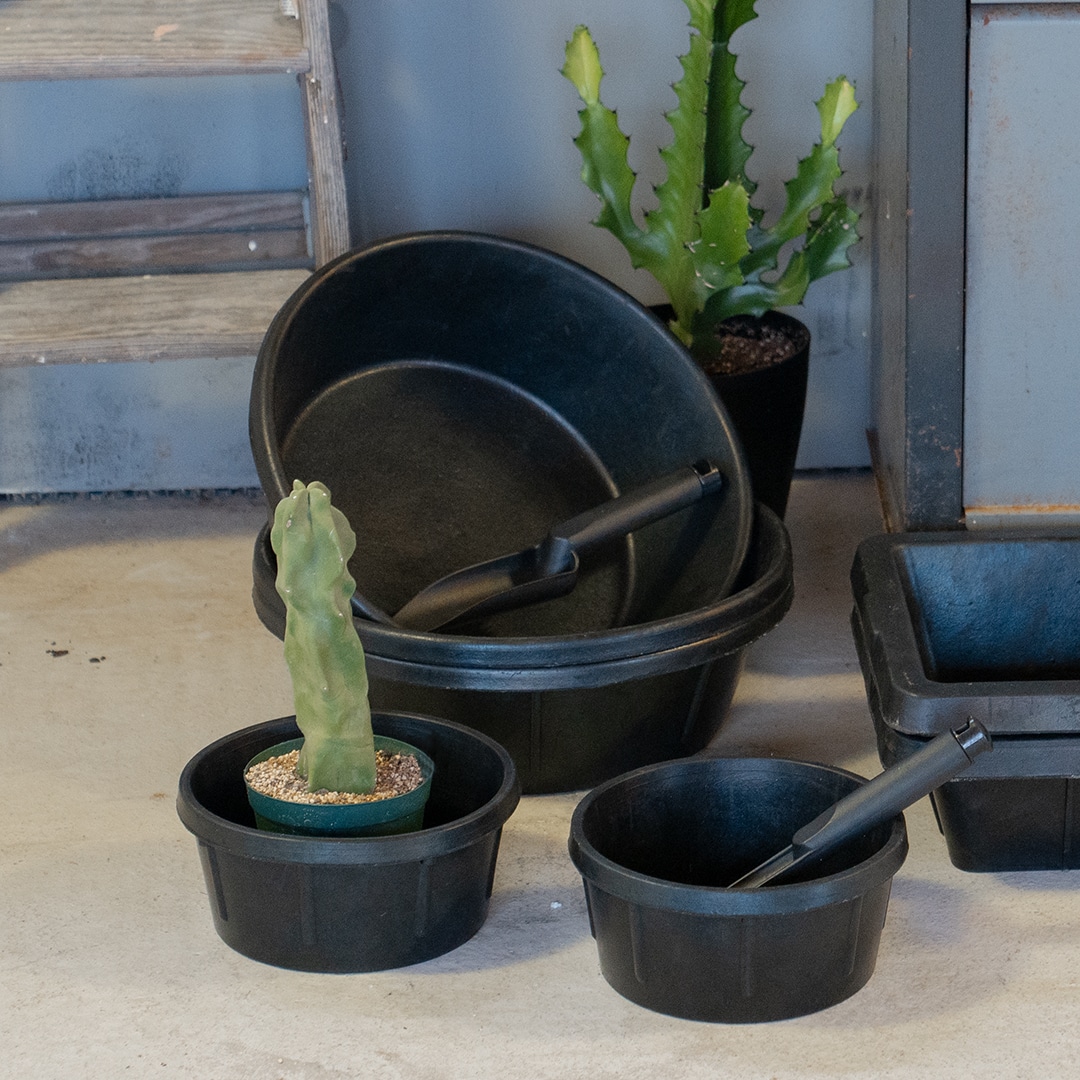タフで重量感のあるBOTANYのラバータブ。タイヤにも使用されるゴムを再加工して生まれました。素材を生かしたシンプルな形状で、ガーデン周りはもちろん、工具入れや汚れたシューズを洗う際のバケツとして、幅広いシーンで活躍します。中央のBOTANYステッカーはそのままに、汚れや破損も気にせずラフに使いたい。