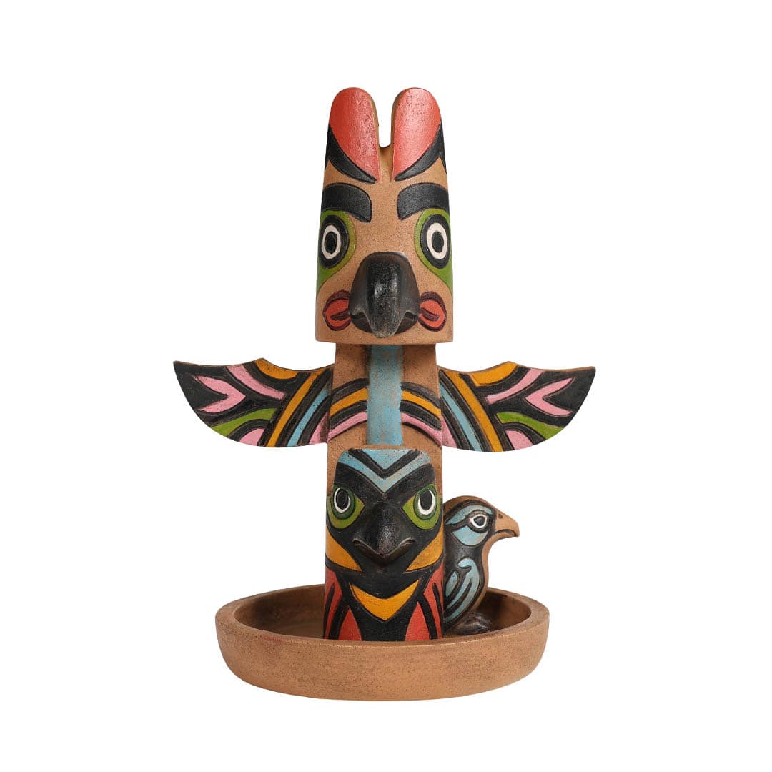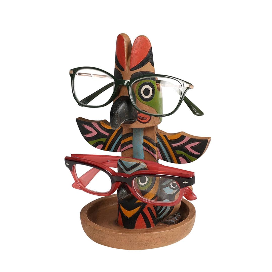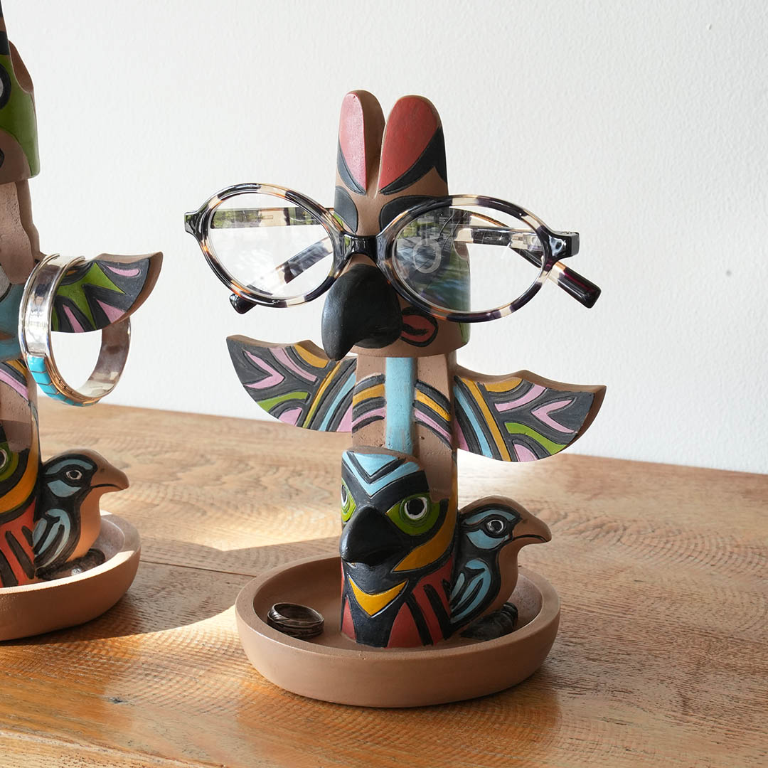 ユニークなトーテムポール型メガネ置き。 眼鏡やサングラスを掛けた姿は、どこか違和感がありながらも馴染んでいるような、不思議なアイテムです。 日常に抜け感を演出しつつ、デスクや玄関など、省スペースでも意外な収納力を発揮します。 下部のプレートは、鍵やアクセサリーなどの小物置きとしても◎。