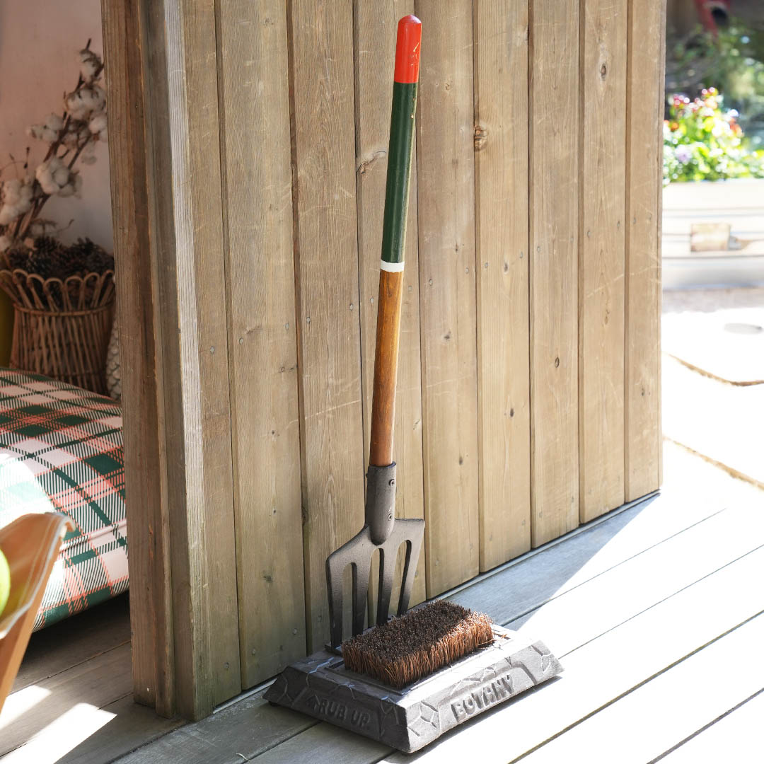 思わず引き抜きたくなる、ガーデンツールをモチーフにしたブーツブラシ。 アフリカの乾燥地帯に自生する植物”亀甲竜”を連想させるようなヒビ割れたデザインの土台には、 『BOTANY』のロゴと、『RUB UP(磨き上げる)』の一言をエンボスで施しました。 アイアンの重厚感とその造形美、細かなディテールが、所有感を満たします。 ハンドルを握り、ブラシ部分で靴底の泥を擦り落とす光景は、どこかユーモラス。 大人から子どもまで、遊び感覚で泥を落とせます。