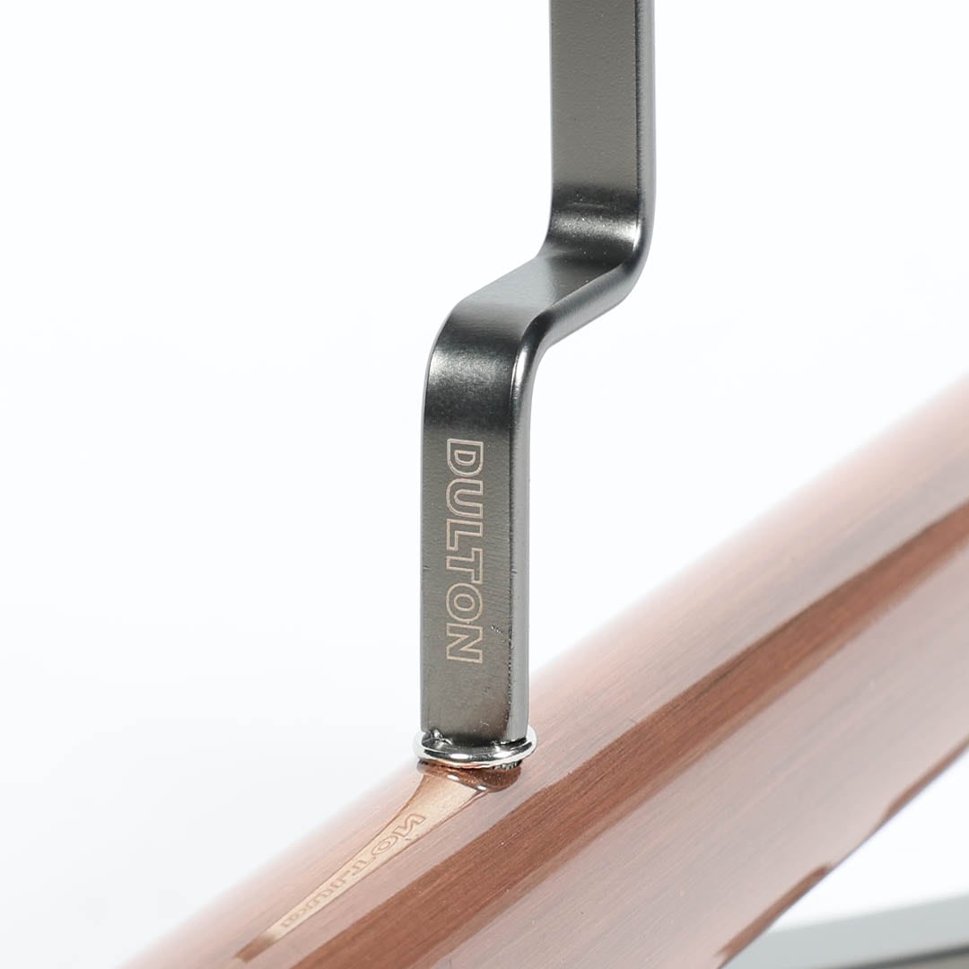 太めのシルエットと美しいステンレスの質感が際立つハンガー。 ホテルやテーラーに並ぶような高級感を漂わせます。 本体には、耐腐食・耐酸化性に優れた314ステンレスを使用している為、一張羅のお供として長くお使いいただけます。 フックは丈夫なスチール製。側面にさりげなくDULTONのレーザーロゴを施しました。 コートやジャケット、ボトムスなど、大切な一着を型崩れから守り、日常のクローゼットを格上げします。