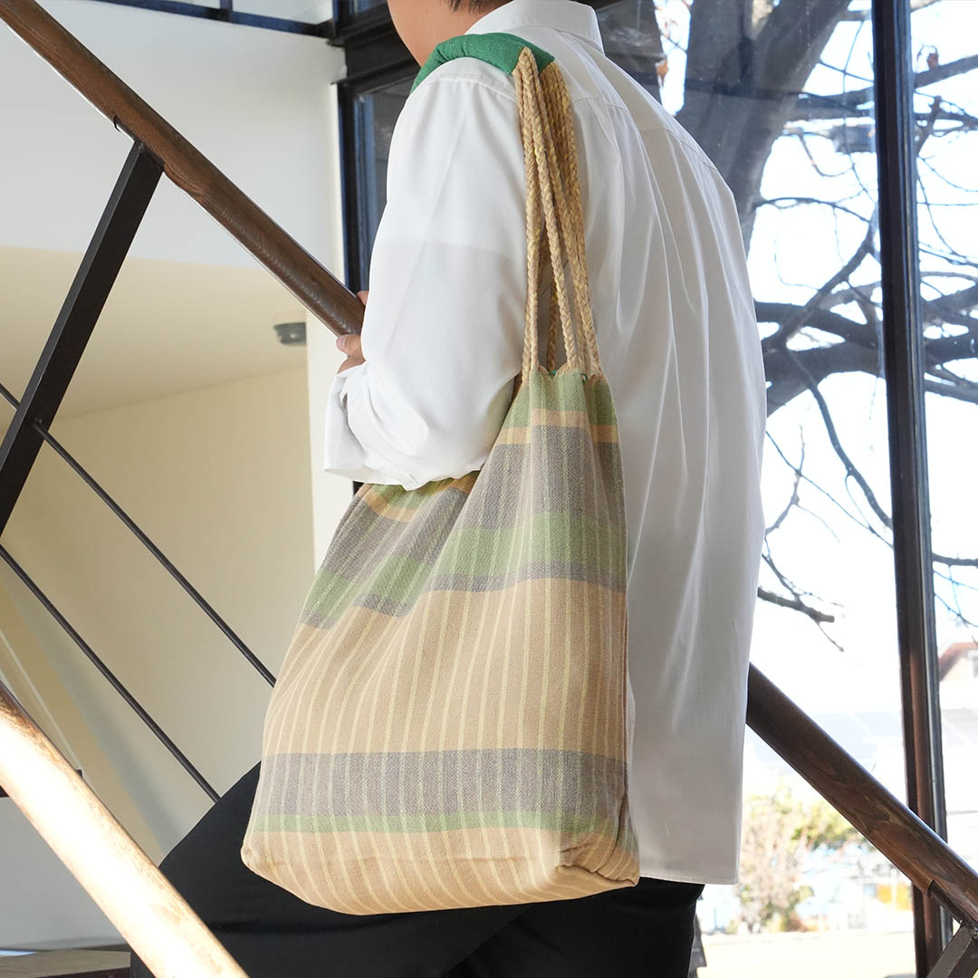 ハンモックのサスペンション部分が持ち手のデザインになったトートバッグ。 春夏〜秋冬と季節に合わせやすく、複数所有したくなる豊富なカラー展開です。 多色使いで、コーディネートに程よいアクセントを加えます。 マチつきで荷物が安定するので、なんとなく置いても絵になる。 織り方やデザインからトラディショナルな魅力を感じられるバッグです。