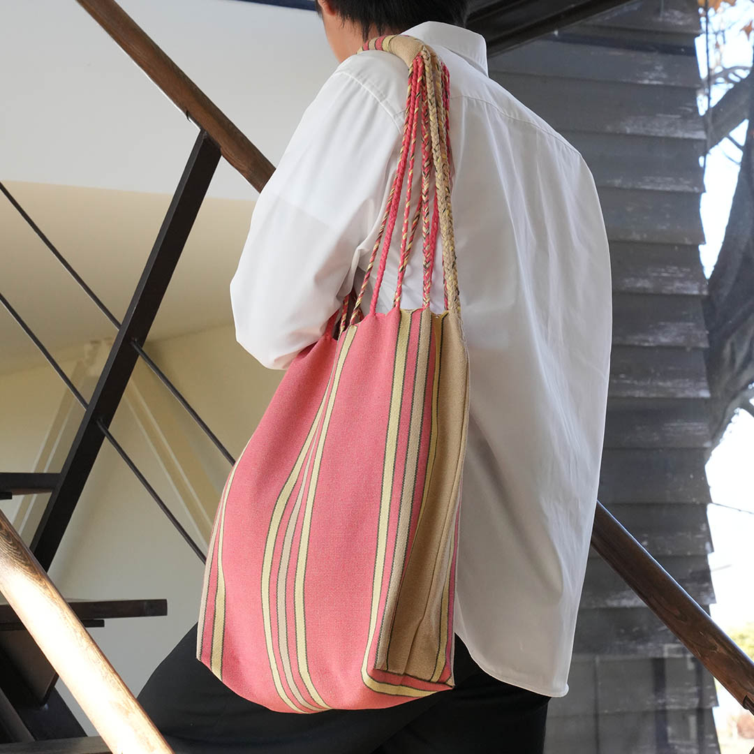 ハンモックのサスペンション部分が持ち手のデザインになったトートバッグ。 春夏〜秋冬と季節に合わせやすく、複数所有したくなる豊富なカラー展開です。 多色使いで、コーディネートに程よいアクセントを加えます。 マチつきで荷物が安定するので、なんとなく置いても絵になる。 織り方やデザインからトラディショナルな魅力を感じられるバッグです。