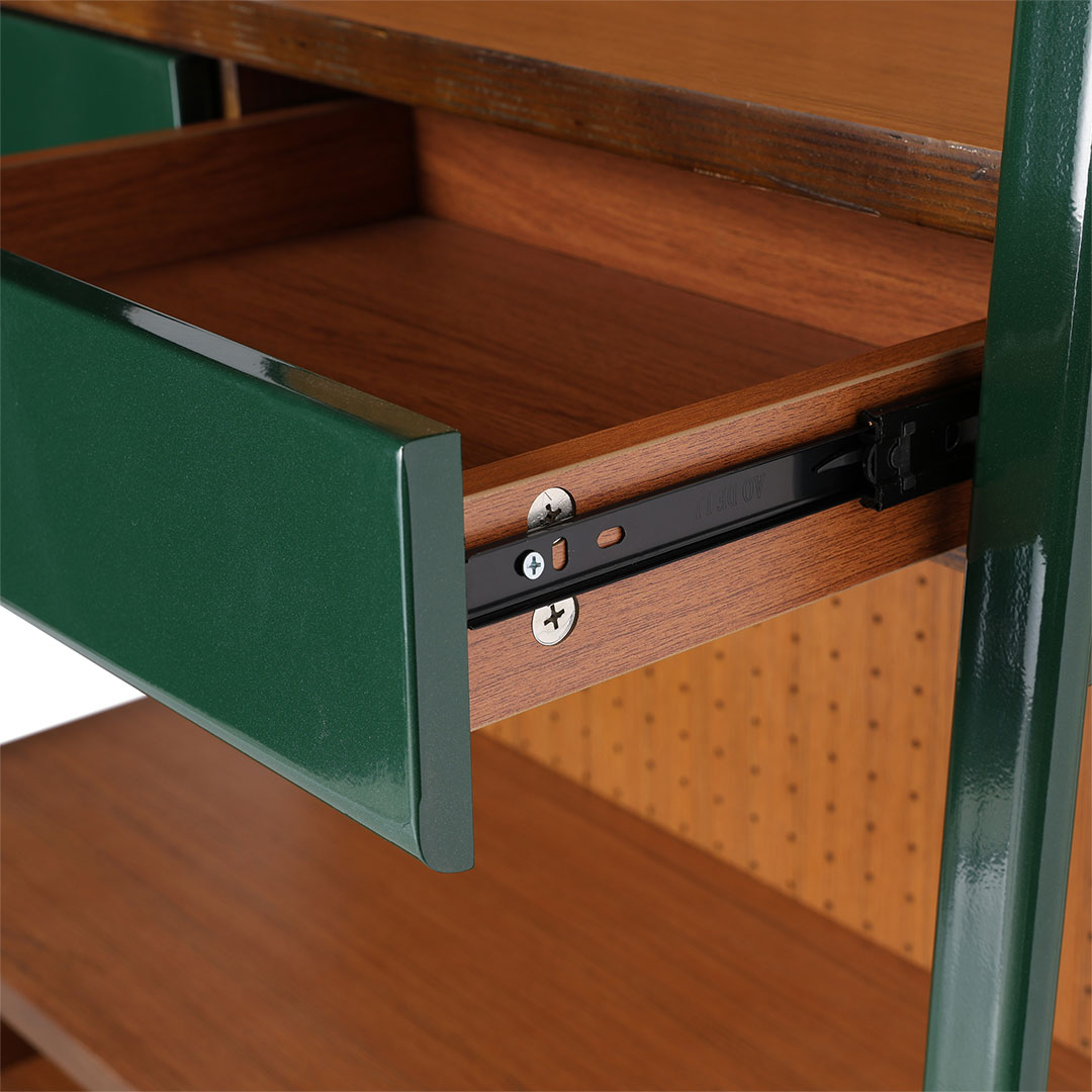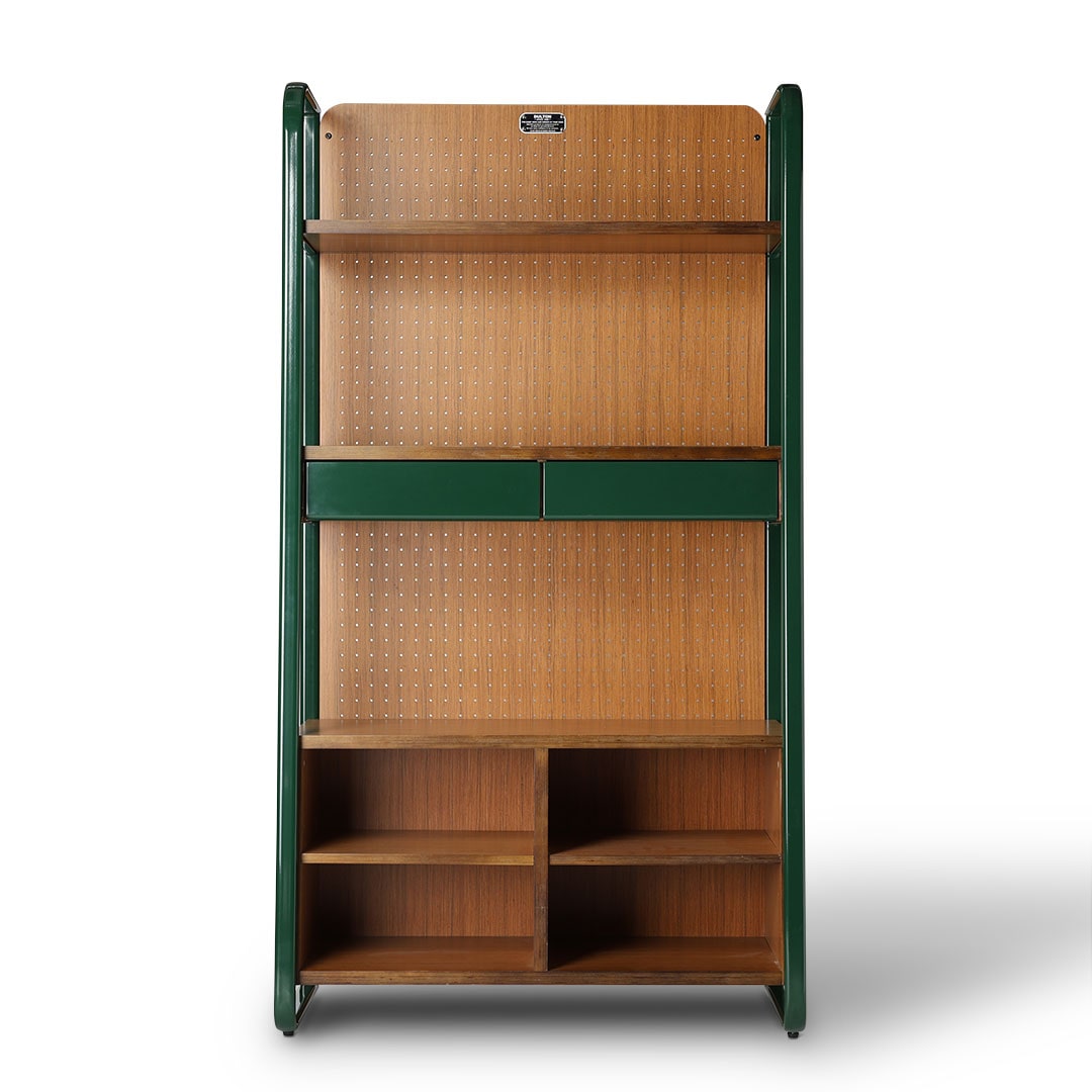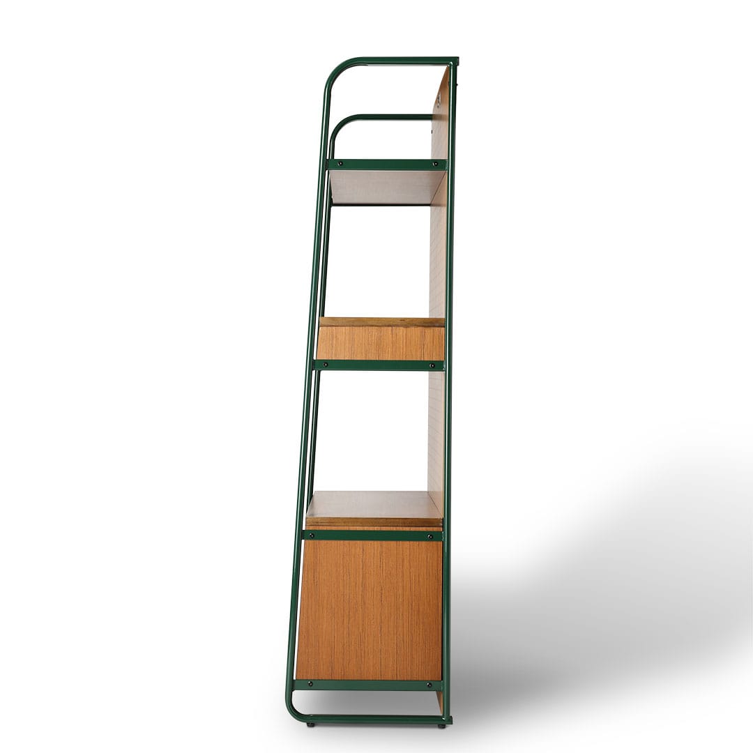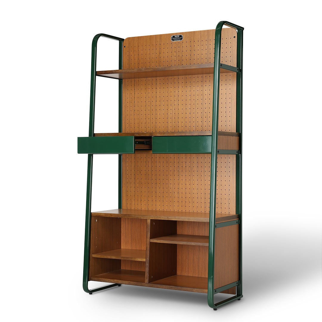 こだわりのコレクションをこだわりの棚に。そんなワガママに、趣味と住空間を緩やかに繋ぐシェルフを。 ずっしりと丈夫なチーク材を支える深緑のフレームは、逞しくもありつつ、角は滑らかに孤を描き、横からの表情も抜け目がありません。 中段の引き出しには、見せたくないものや、埃から守りたいアクセサリーなどの収納にも。 背板はペグボード仕様なので、活用次第で魅せる収納の幅が更に広がります。同シリーズのデスクやチェアと合わせれば、唯一無二の空間に。