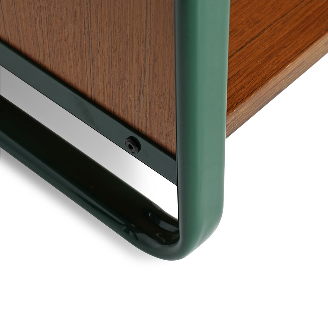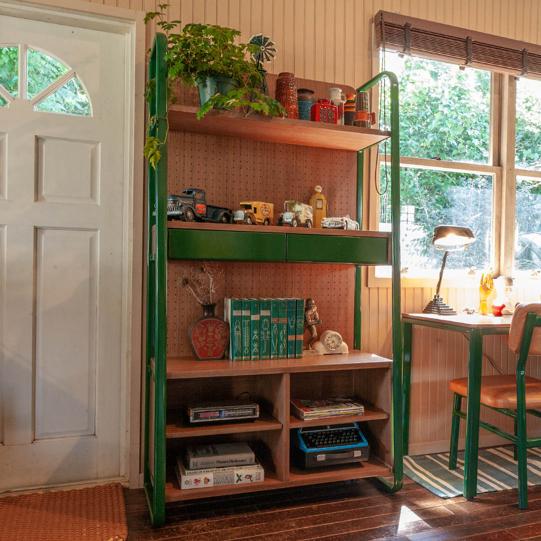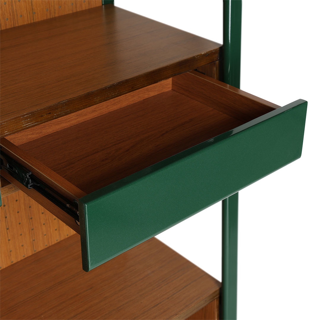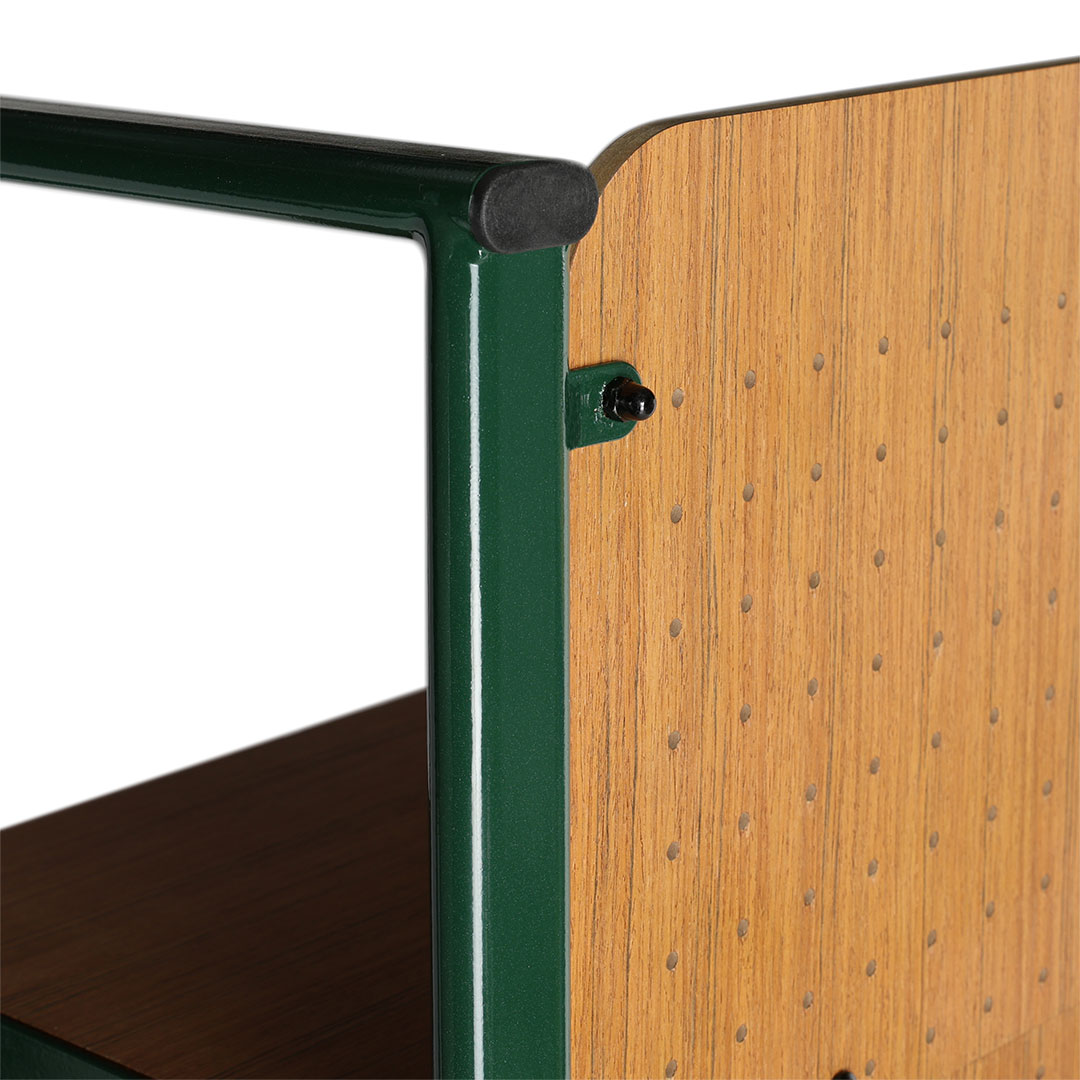 こだわりのコレクションをこだわりの棚に。そんなワガママに、趣味と住空間を緩やかに繋ぐシェルフを。 ずっしりと丈夫なチーク材を支える深緑のフレームは、逞しくもありつつ、角は滑らかに孤を描き、横からの表情も抜け目がありません。 中段の引き出しには、見せたくないものや、埃から守りたいアクセサリーなどの収納にも。 背板はペグボード仕様なので、活用次第で魅せる収納の幅が更に広がります。同シリーズのデスクやチェアと合わせれば、唯一無二の空間に。