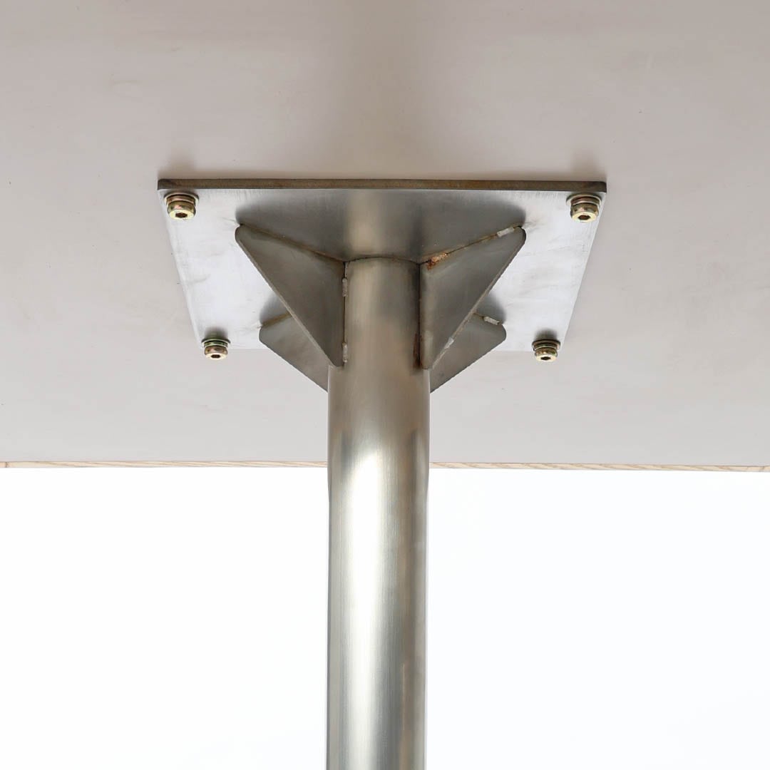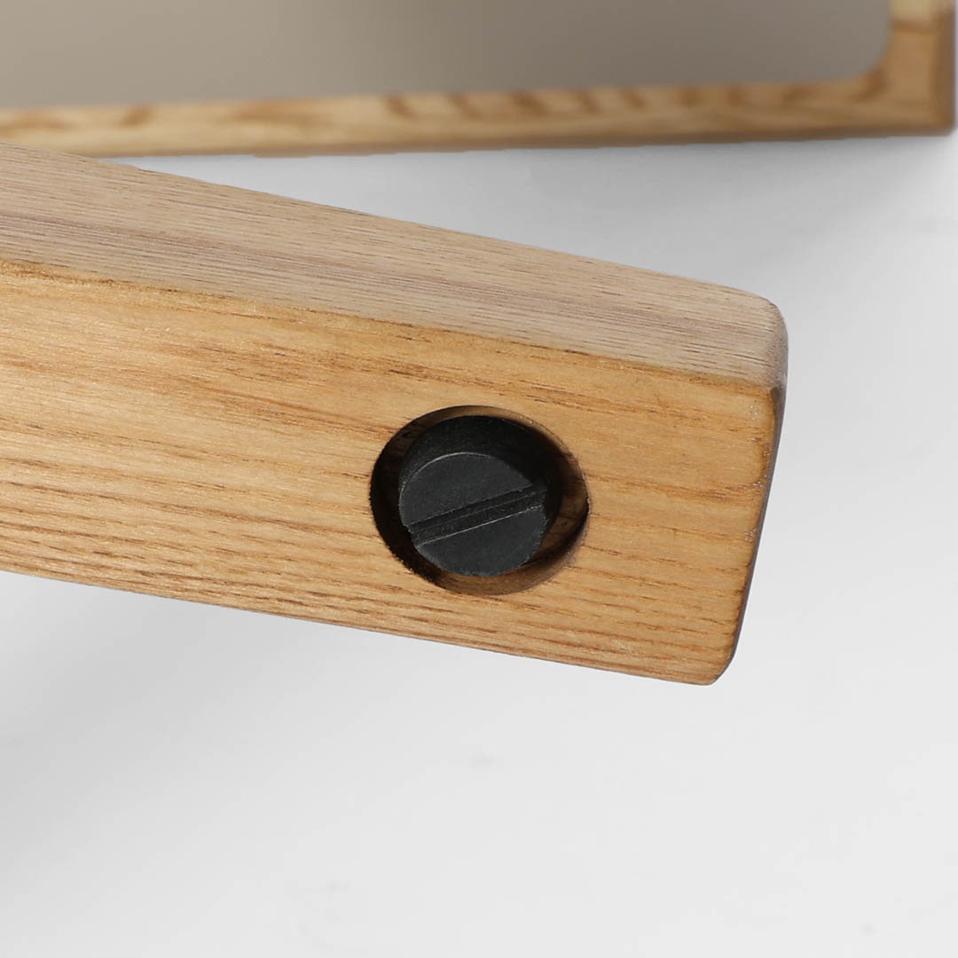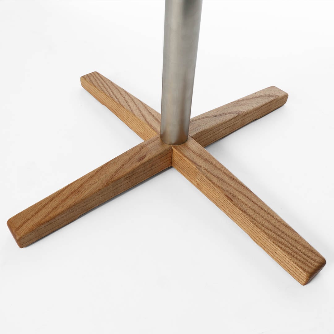 無機質なステンレスポールを支える脚元には、丈夫で表情が豊かなアッシュ材を採用。安定感と自然の温もりを添えます。どの角度からでも座りやすいスマートな一本脚デザインは、コージーな空間にもぴったりです。