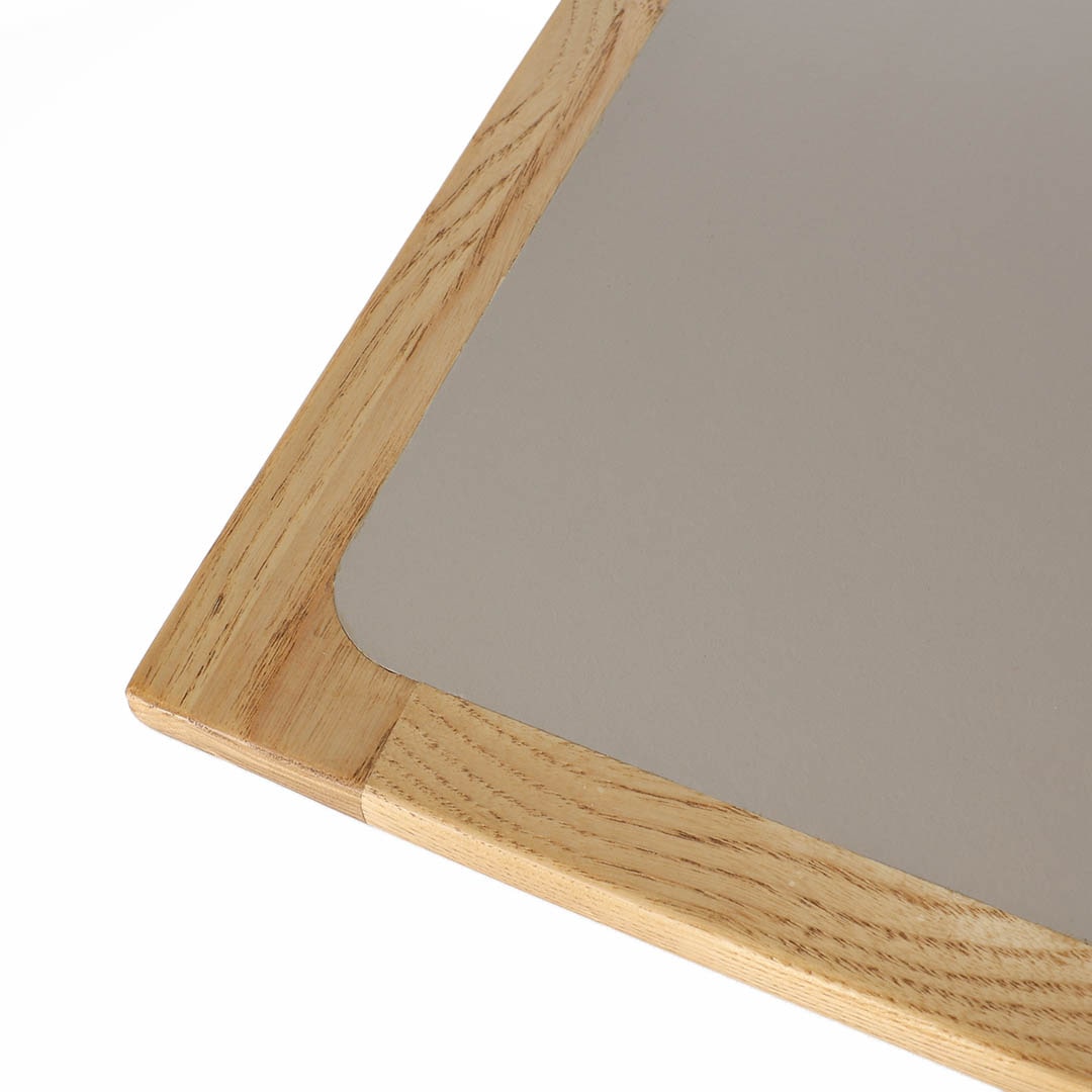 柔らかなトーンで仕上げたメラミン天板は、熱や水分に強く、高い耐久性が特徴。汚れにくく、お手入れも簡単なので、日常使いでもハードにお使いいただけます。縁にあしらった天然木とのコントラストが空間のアクセントに。