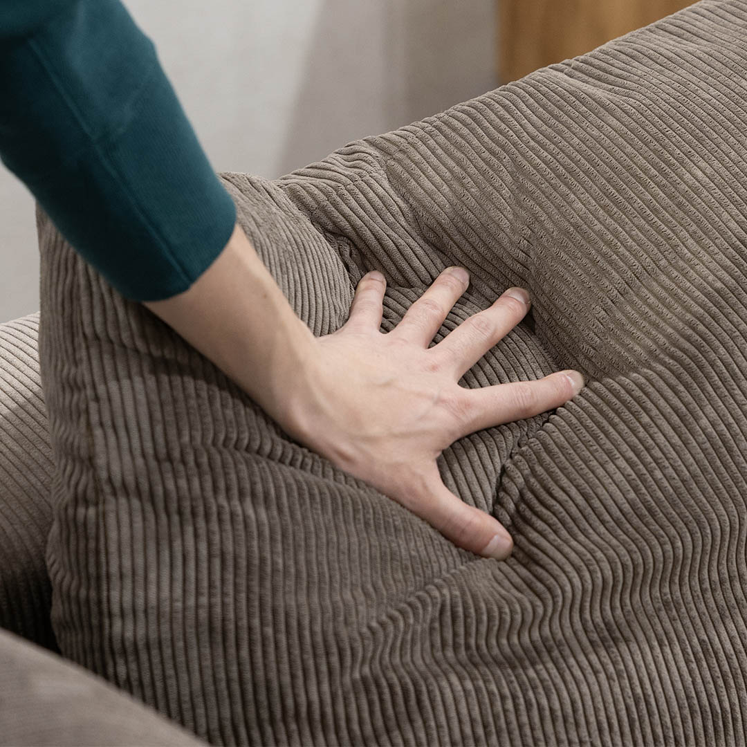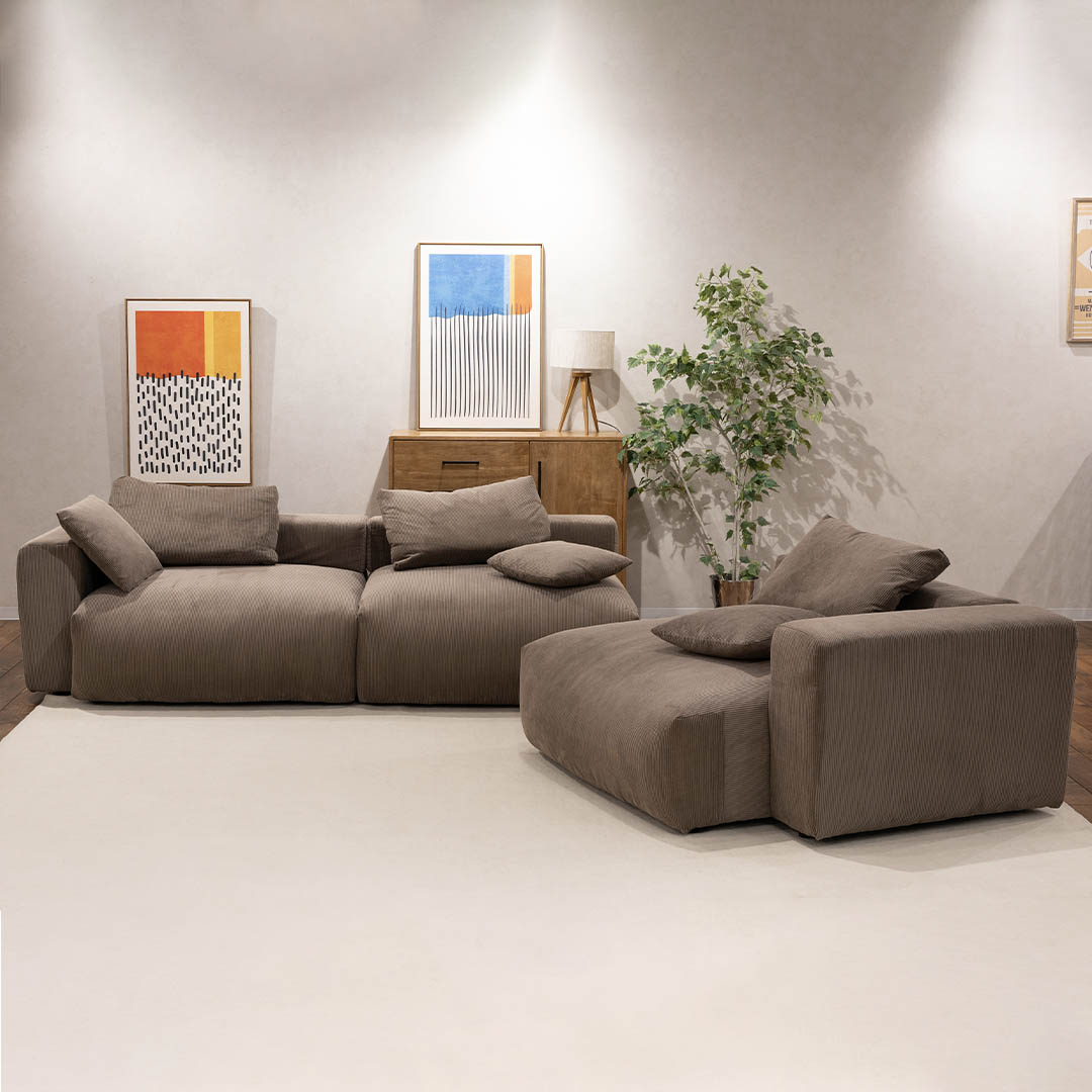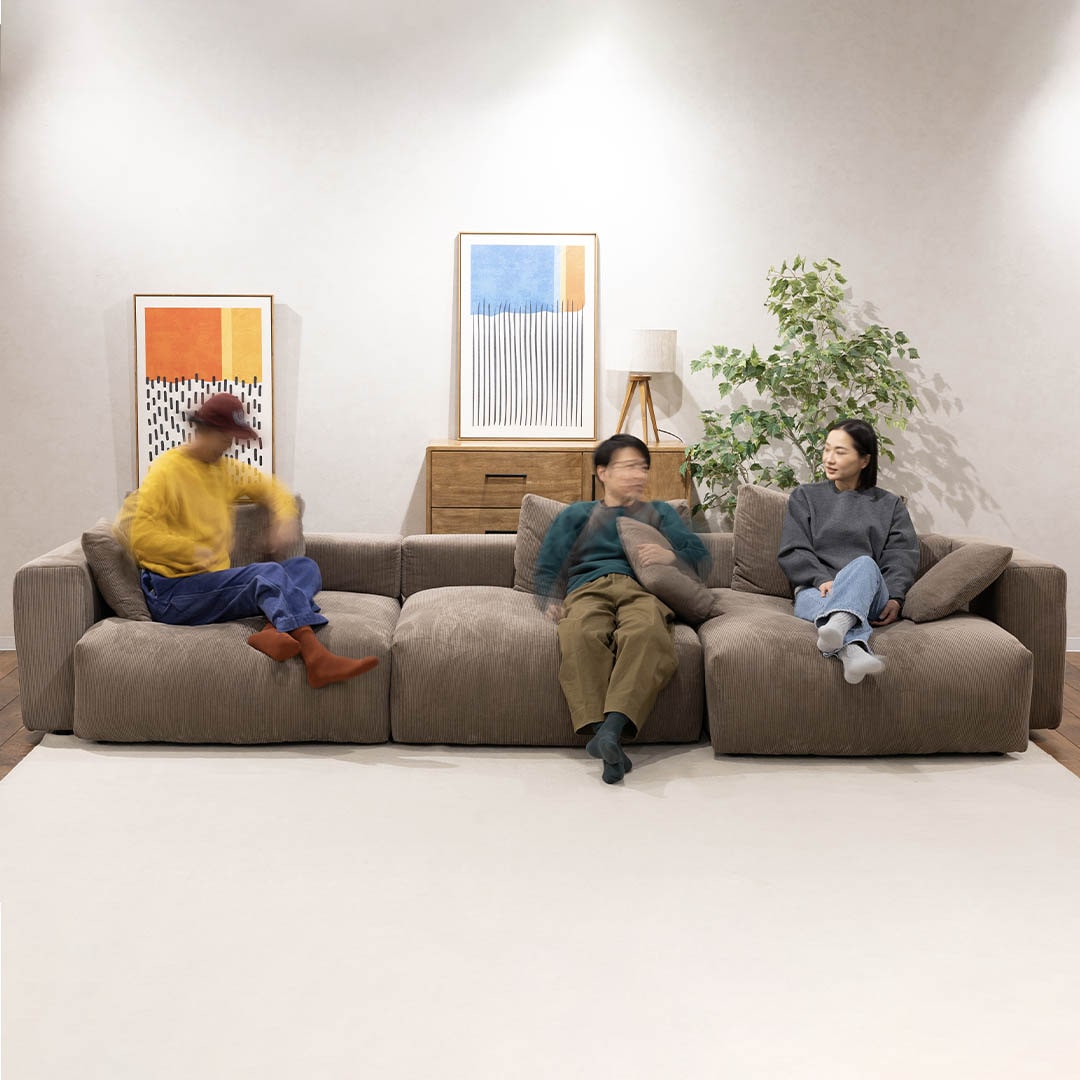 こだわりのコーデュロイ生地は、触れるたびに感じる柔らかさと、光の角度で変化する豊かな表情が特徴。使い込むほどに味わいが増し、日々の暮らしと共にソファも成長していきます。