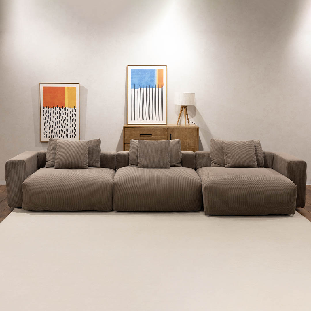 どんな瞬間もゆったりと受け止めてくれる贅沢な広さ。ひとりで深く腰を沈めても、家族や仲間と寄り添っても心地よい。“広々と寛ぐ”を追求した、自由な発想のモジュールソファです。