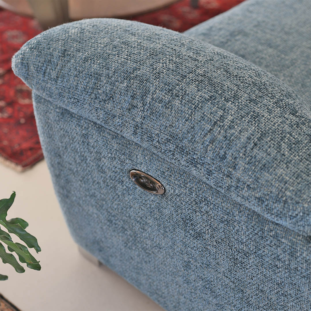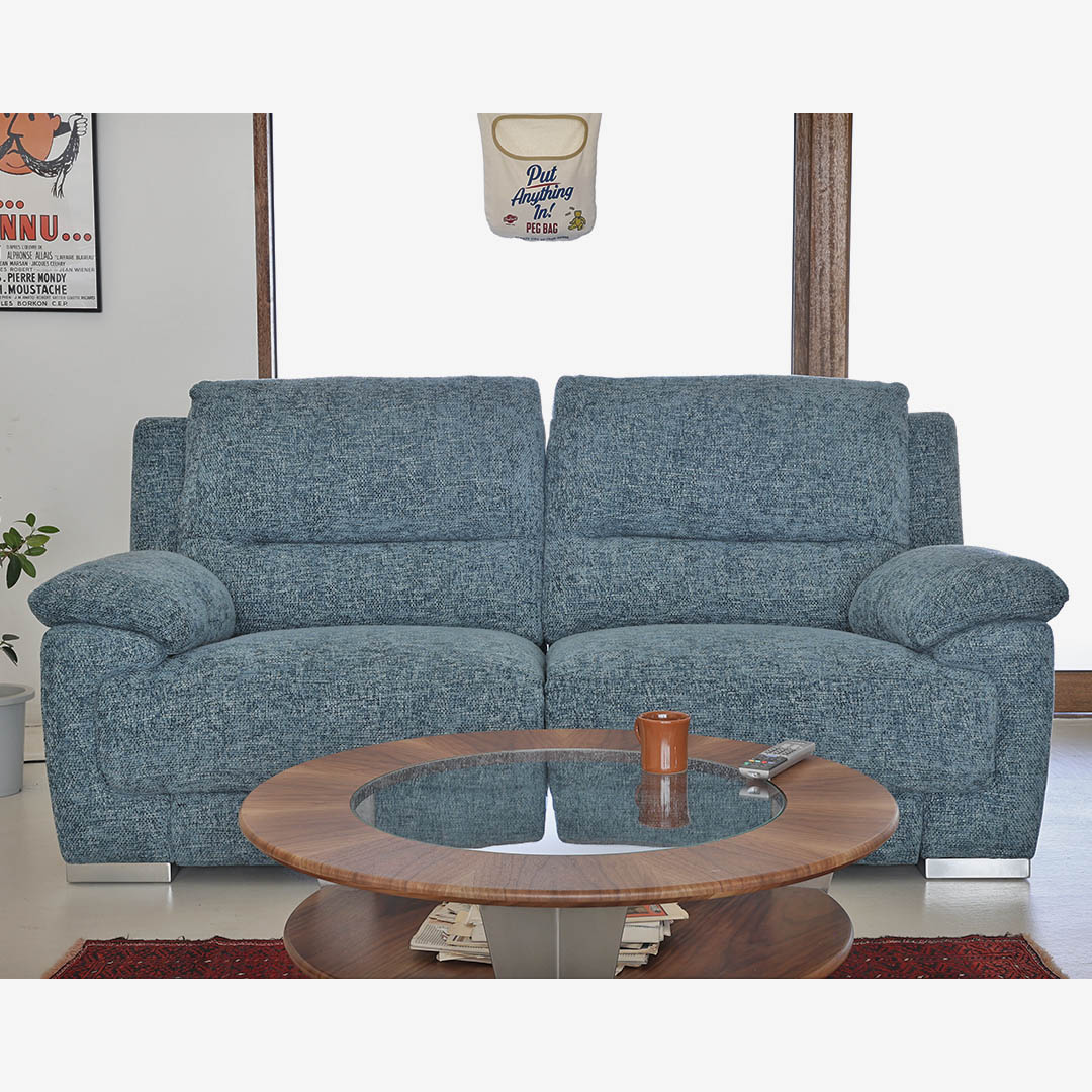 電動リクライニング機能を差し置いても、個性的で重厚な佇まいの2シーター。傾斜のついた肘掛けが生み出す開放感が心地よく、使い勝手の良いソファです。