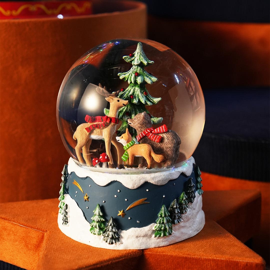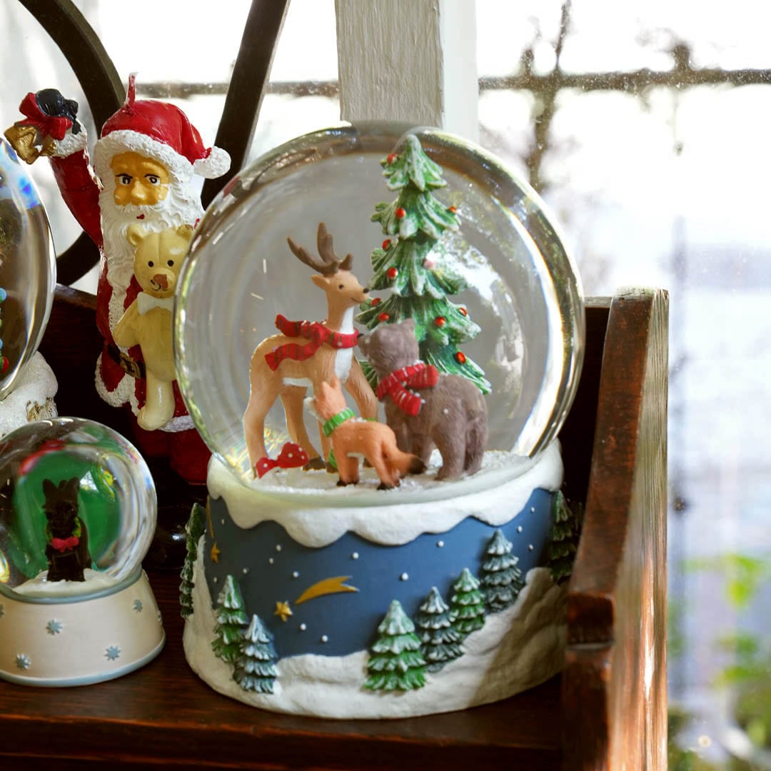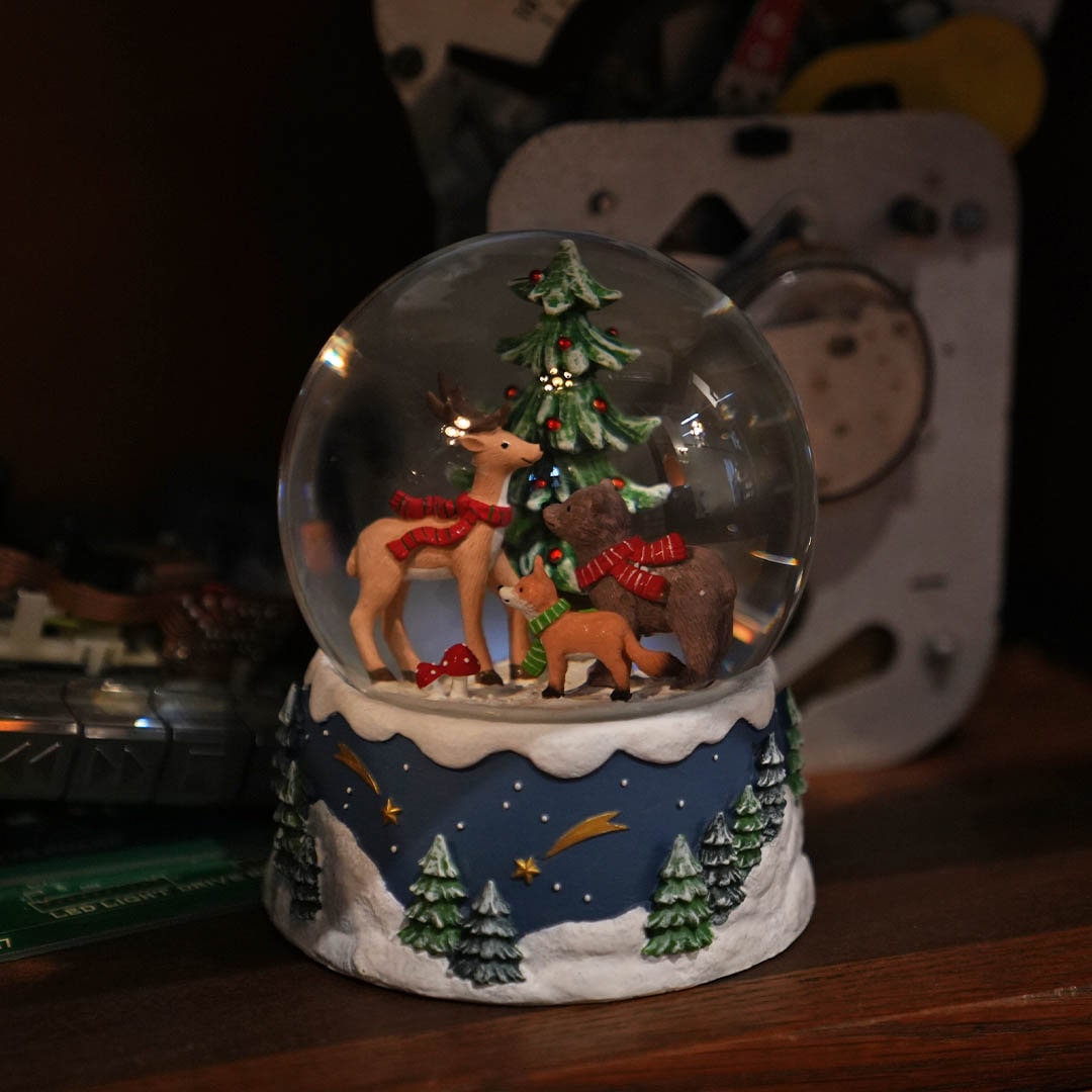 鹿やクマ、キツネなど、森の仲間たちがツリーに身を寄せる姿が微笑ましいスノードーム。 見上げる夜空にはいくつもの流れ星が尾を引いているようです。 ちょっとしたスペースでも気兼ねなく愉しんで欲しい。 リビングや窓辺に、そっと寄り添う温かな存在です。