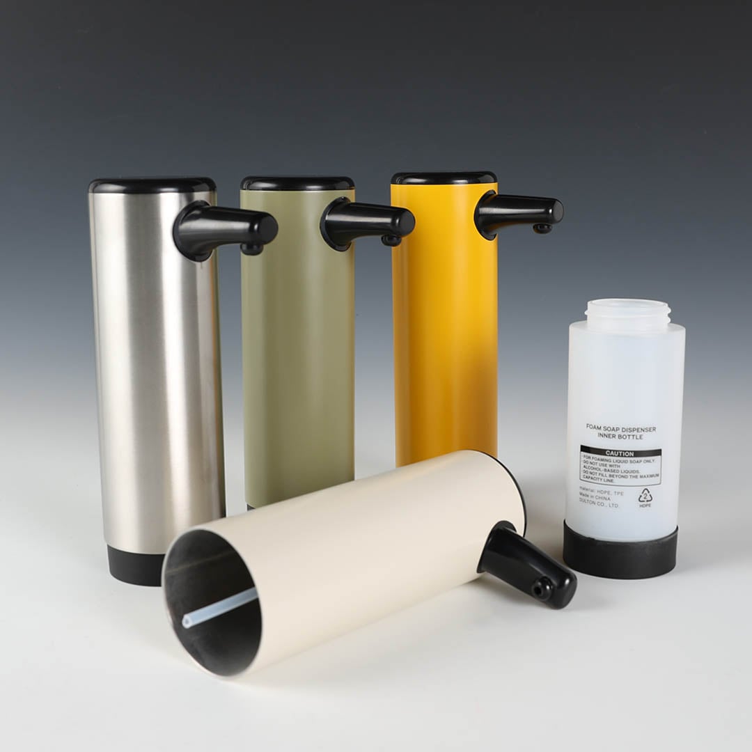 スタイリッシュなデザインの泡石鹸用ソープディスペンサー。 頭をワンプッシュするだけで、きめ細かなフォームソープを出すことができます。 スリムでシンプルなフォルムはキッチンや洗面所など、置く場所を選ばずすっきりフィット。 底面は滑りにくいTPE素材、本体は錆びにくい304ステンレススチールを使用しており、 毎日の使用に安心で、長く清潔に使うことができます。 インテリアや気分に合わせて選べるカラー展開も嬉しい。