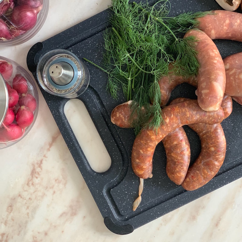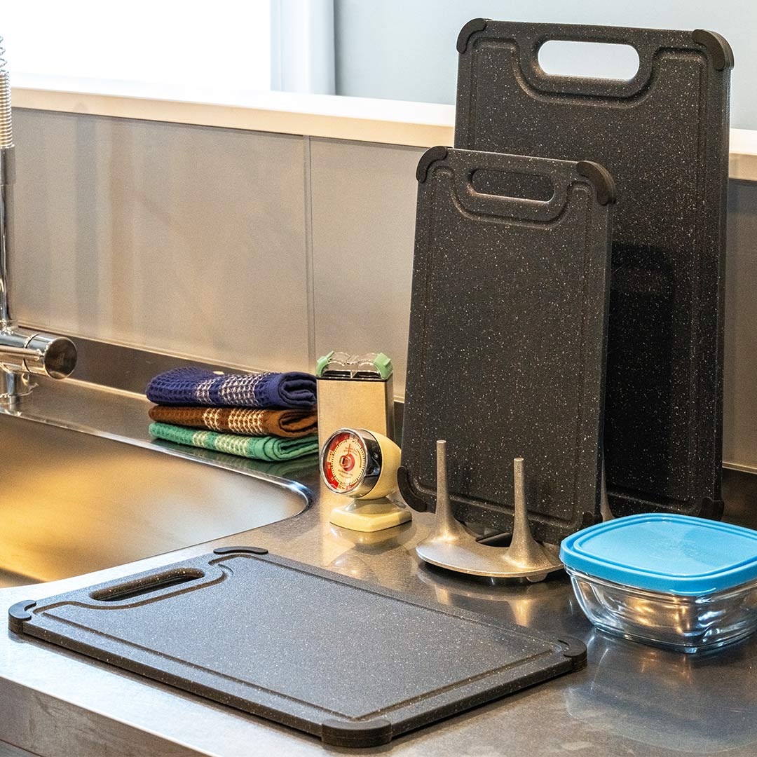 毎日使うまな板だから、デザイン性、使いやすさ、サイズ感など重視するポイントは多数。こちらのまな板は、デイリーユースで大切なポイントをシンプルに形にしました。深いグレーのマーブル柄は、傷や汚れが目立ちにくいのが嬉しいポイント。水切れがとても良く、薄く軽量なのでアウトドアシーンにも最適です。何枚か揃えておきたくなるS,M,Lのサイズ展開です。