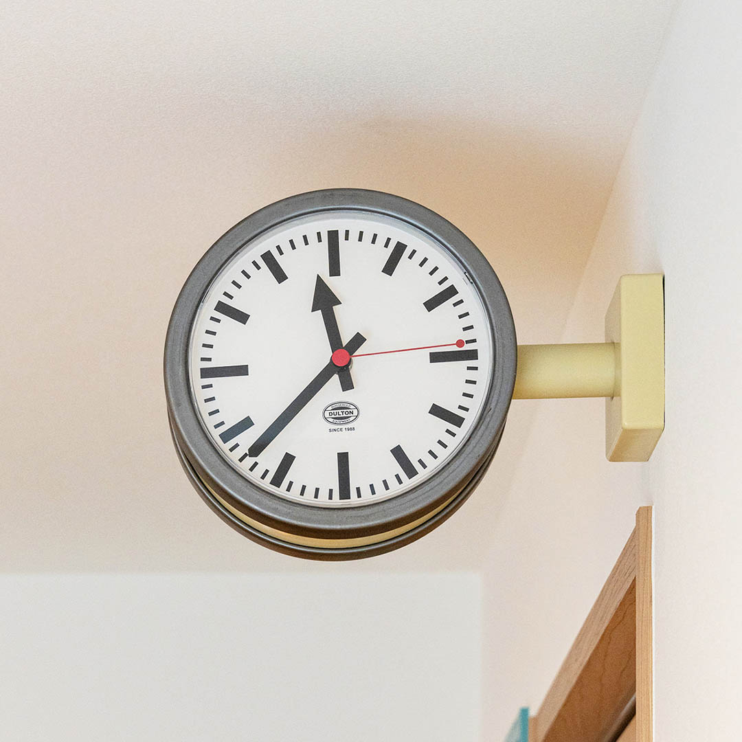 DULTONの人気アイテムDOUBLE FACE CLOCK 170Dより新たなデザインが登場。 欧米の空気が濃密に感じられる、両面表示のウォールクロックです。 コンパクトサイズでありながら、シンプルで力強い盤面デザインと、 RAWカラーを採用した大胆な2トーンのボディカラーで、無骨で存在感のあるプロダクトになりました。