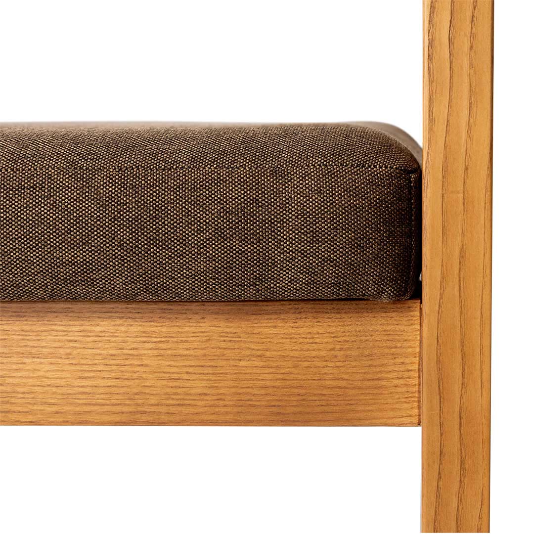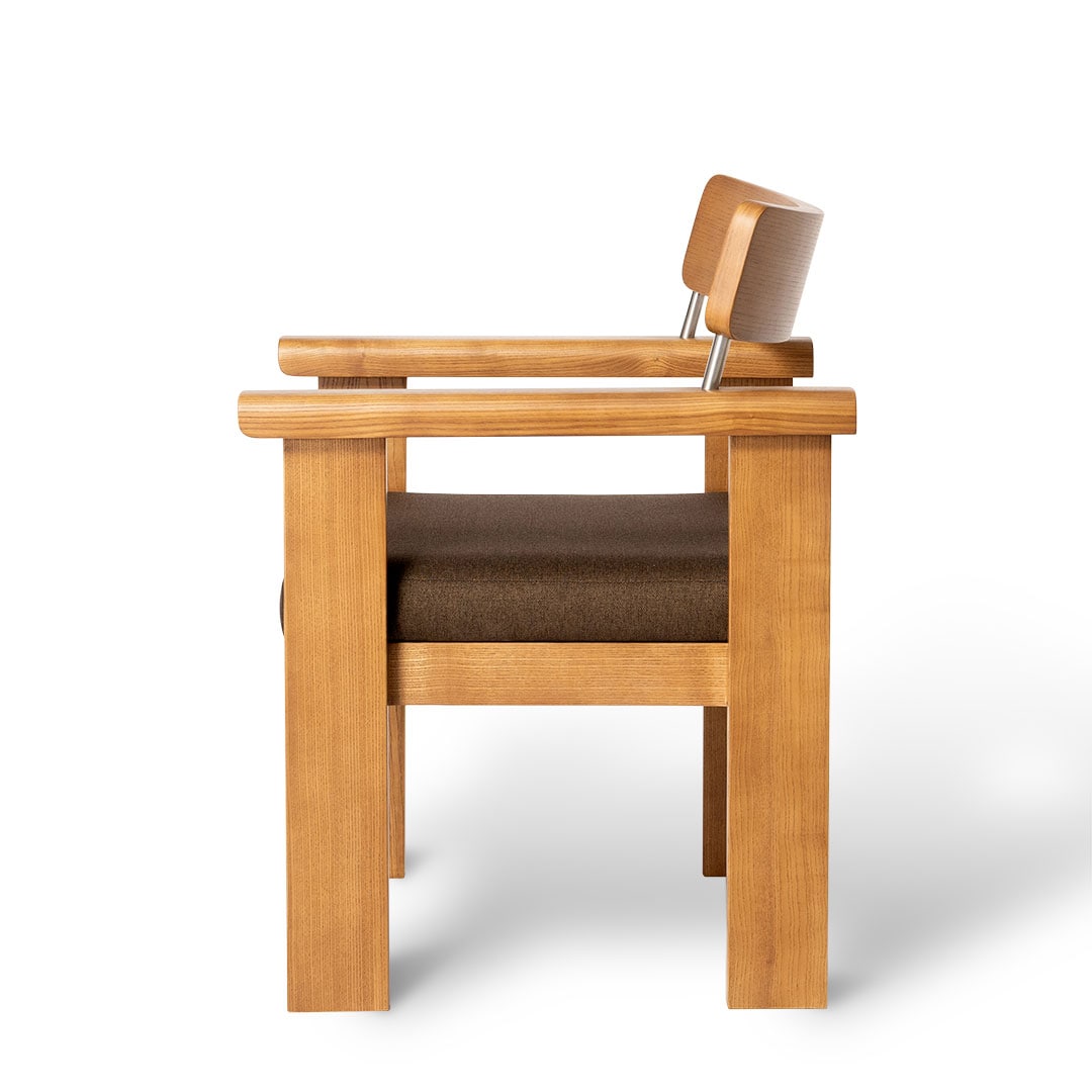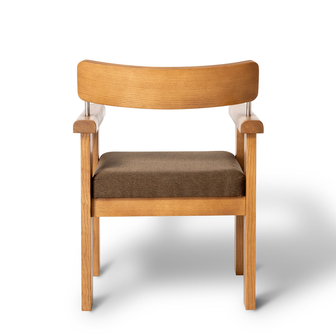 幅広の脚、Rの効いたアームレスト、バックレストを支えるガルバナイズドの支柱など、こだわりのディテールを詰め込まれた、静かな存在感を放つダイニングチェア。 フレームには無垢のアッシュウッドを使用。堅く耐久性があり、木目の豊かな表情を楽しめます。 広めの座面と木の感触が心地よく、どっしりとした佇まいに安心感すら覚えます。 同シリーズのテーブルと合わせれば、互いに造形を引き立て合い、空間に統一感と奥行きを演出。 ダイニングにはもちろん、部屋の一角に置いても画になります。